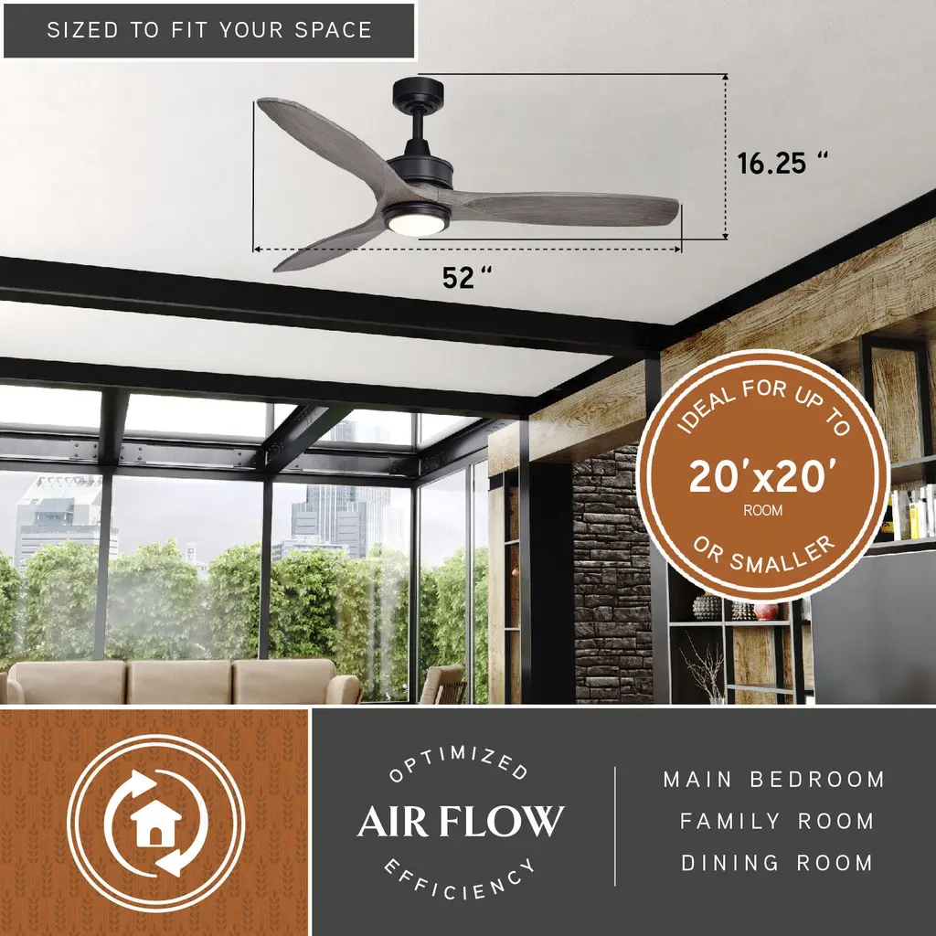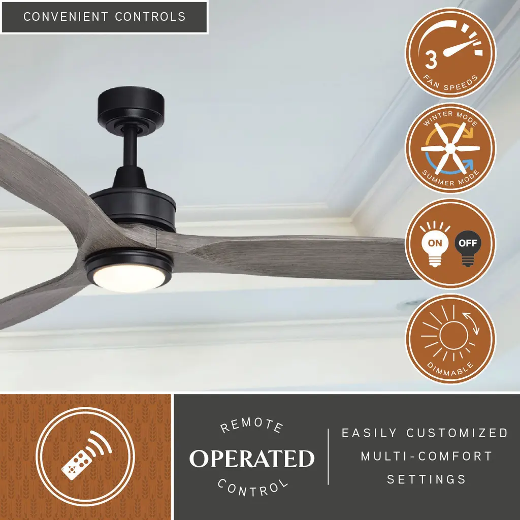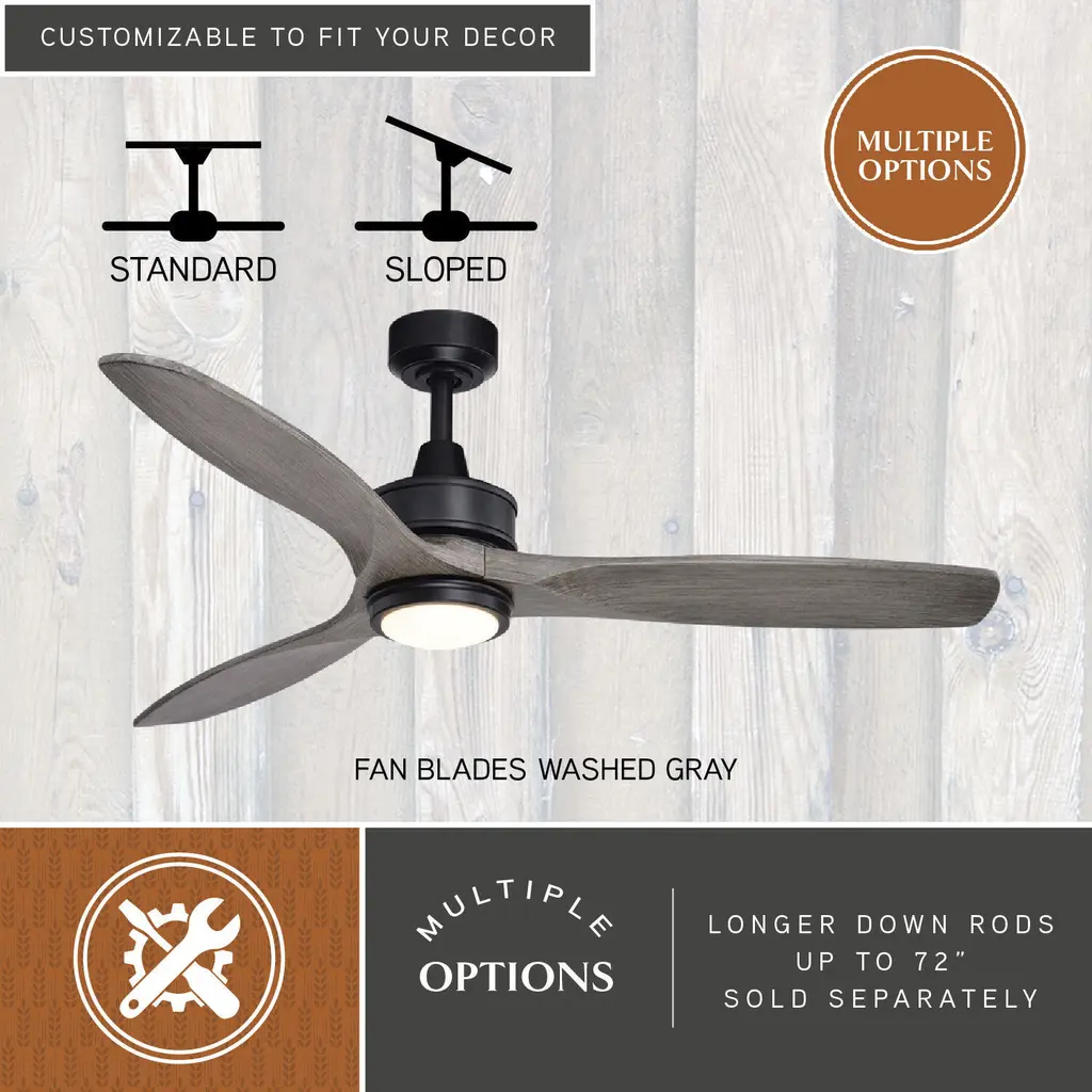 The black finish, hand carved washed gray solid wood blades and clean lines give the Curtiss ceiling fan its on-trend contemporary look. This fan is compatible with sloped ceilings and includes a 6 inch downrod (longer down rods sold separately). Exterior damp rated, ideal for indoor or outdoor spaces such as entryway, family room, bedroom, bathroom, living room, kitchen, or covered outdoor porches. Remote control included for added convenience. An integrated LED light kit provides energy savings, low maintenance and long-lasting performance.