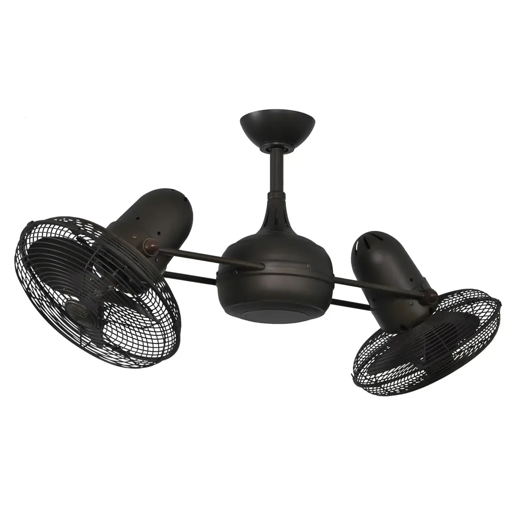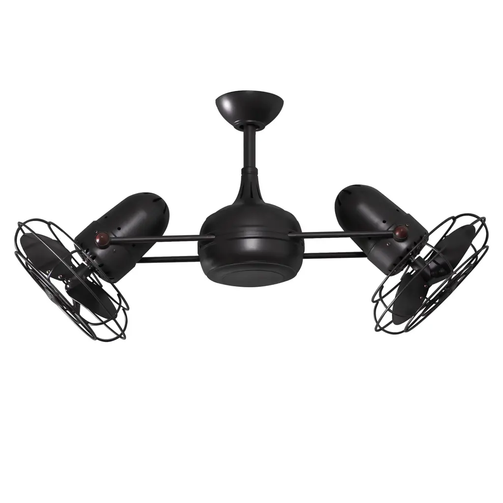 The double-headed rotational ceiling fan, Dagny, with cylindrical central housing and straight, parallel arms, is designed in the retrospective aesthetic. The Dagny offers fluid lines and quiet axial rotation. The motor heads can be infinitely positioned in 180-degree arcs for optimum air movement; the greater the angles of the motors to the horizontal support rods (up or down), the faster the axial rotation. A slow, controlled axial rotation is achieved by both motor head position and fan blade speed. Matthews rotational fans circulate heat and air-conditioning more efficiently than traditional paddle fans. Features