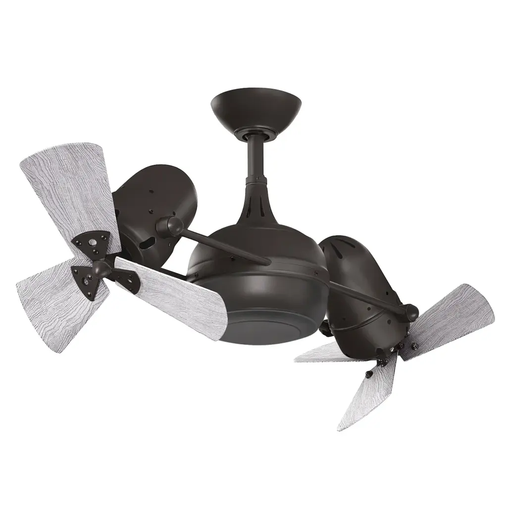 The double-headed rotational ceiling fan, Dagny, with cylindrical central housing and straight, parallel arms, is designed in the retrospective aesthetic. The Dagny offers fluid lines and quiet axial rotation. The motor heads can be infinitely positioned in 180-degree arcs for optimum air movement; the greater the angles of the motors to the horizontal support rods (up or down), the faster the axial rotation. A slow, controlled axial rotation is achieved by both motor head position and fan blade speed. Matthews rotational fans circulate heat and air-conditioning more efficiently than traditional paddle fans. Features
