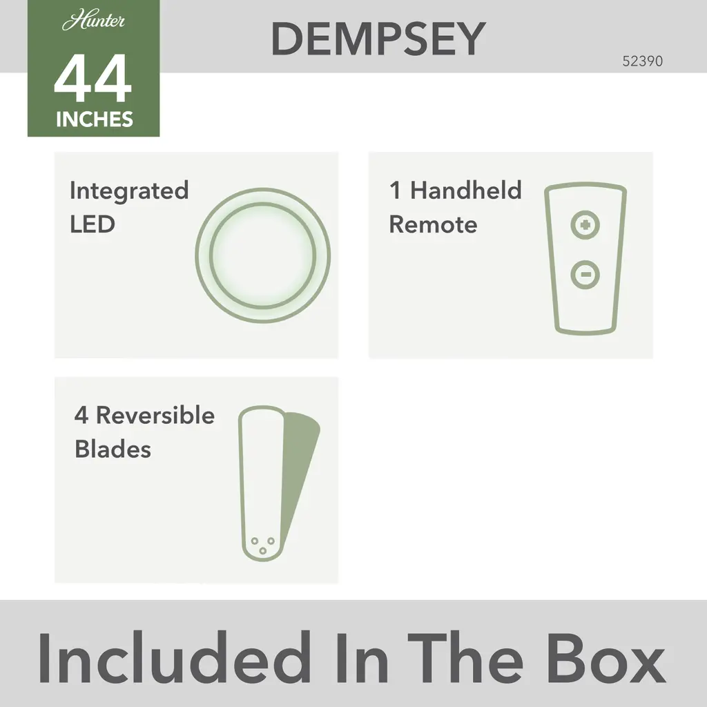 For homes with large rooms and average-height ceilings, we offer the Dempsey low-profile 52-inch fan. This fan will fit seamlessly in your home. Its angular blades and choice of beautiful finishes will create an inspired look in your space. The Dempsey’s fully dimmable LED light gives you control over the brightness in your space, and the 52 inch blades will keep your great room feeling good. Add other fans from the Dempsey collection for a consistent modern style throughout.