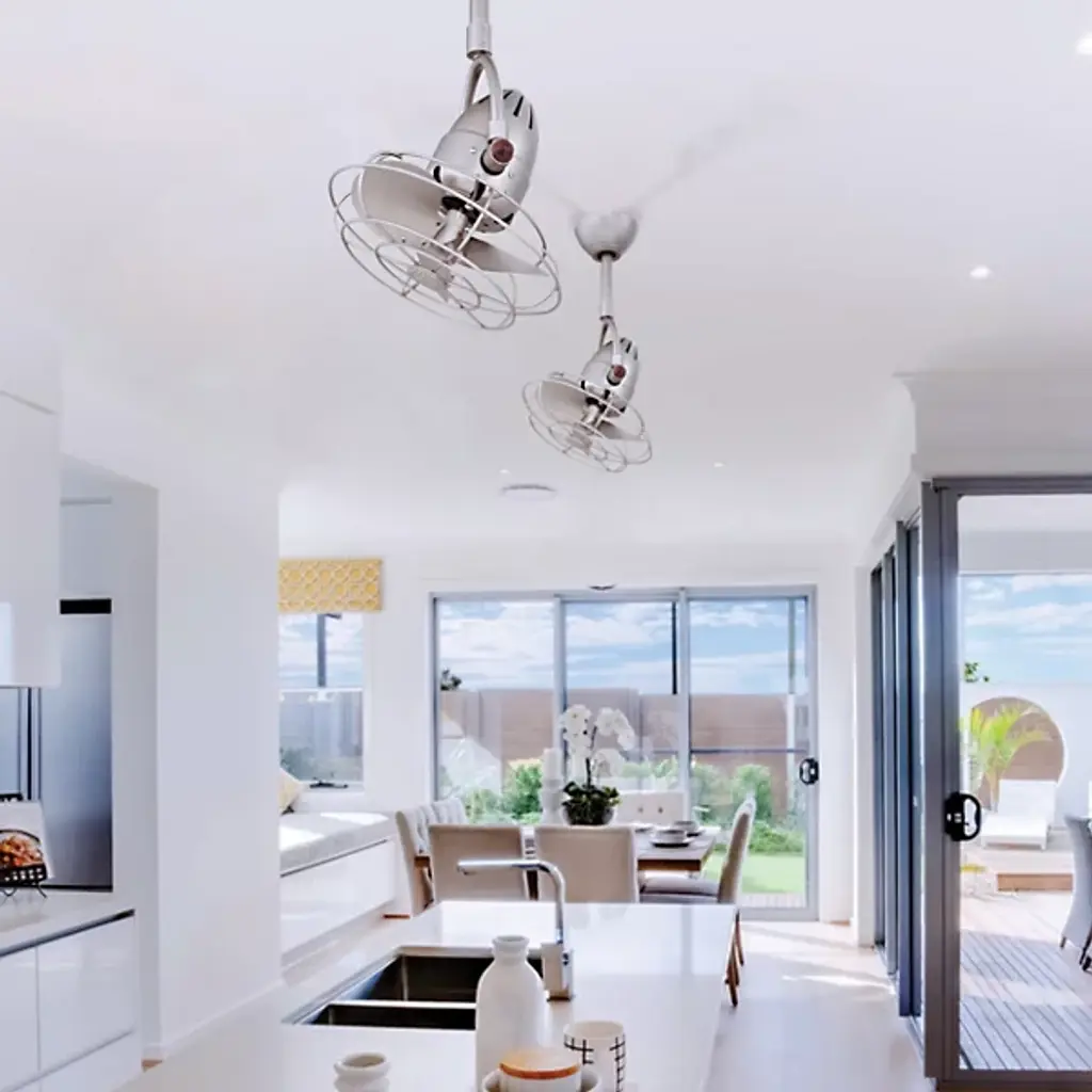 The Atlas by Matthews Fan Co. Diane Ceiling Fan generates refreshing air circulation with its heavy-duty oscillating fan and adds an element of urban architecture to interior and exterior decor. The Diane Ceiling Fan features an oscillating head, three fan speeds, and a standard remote control.