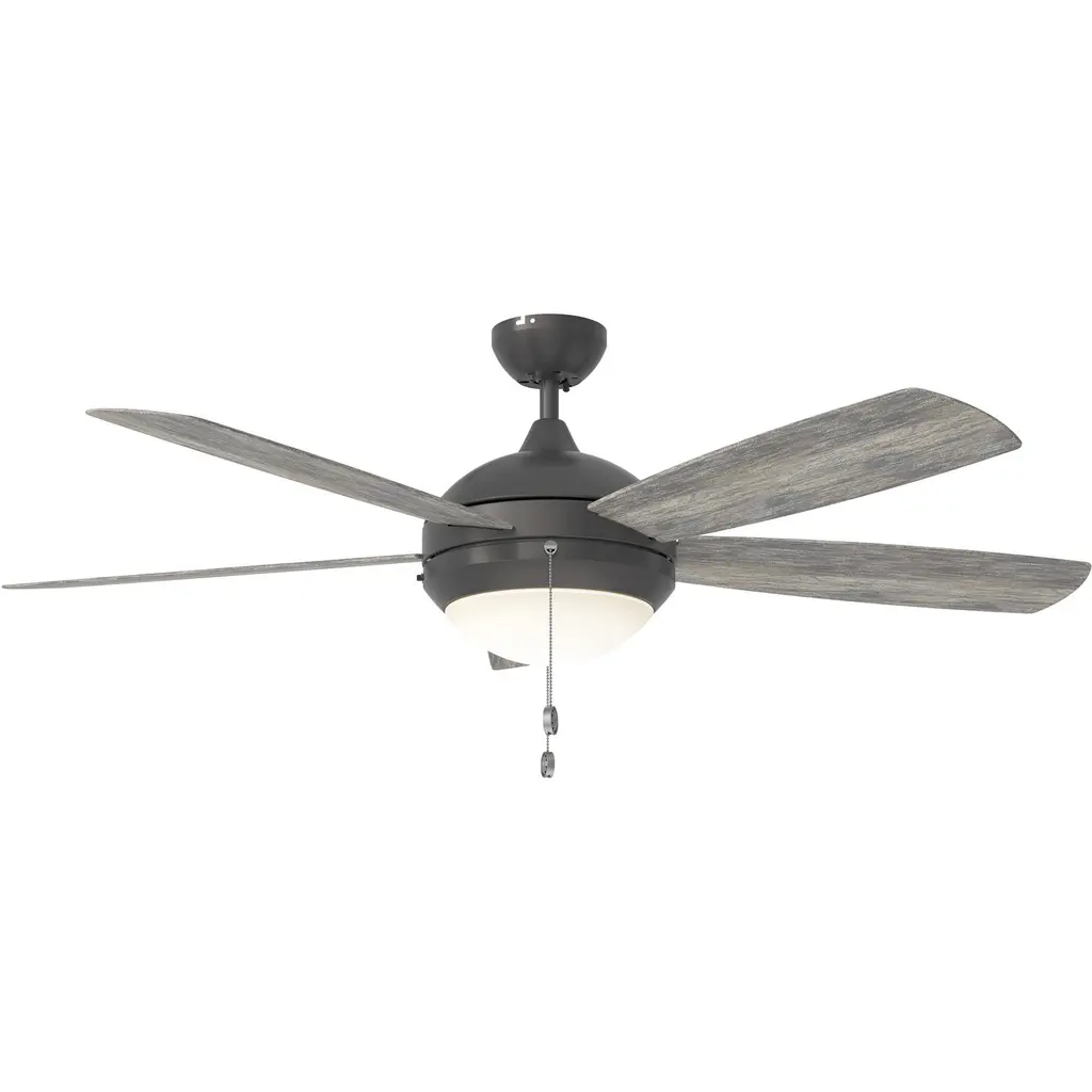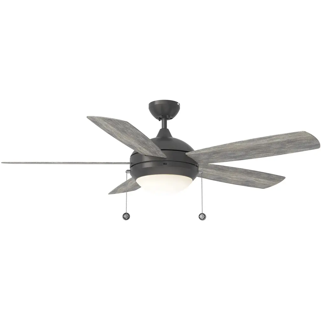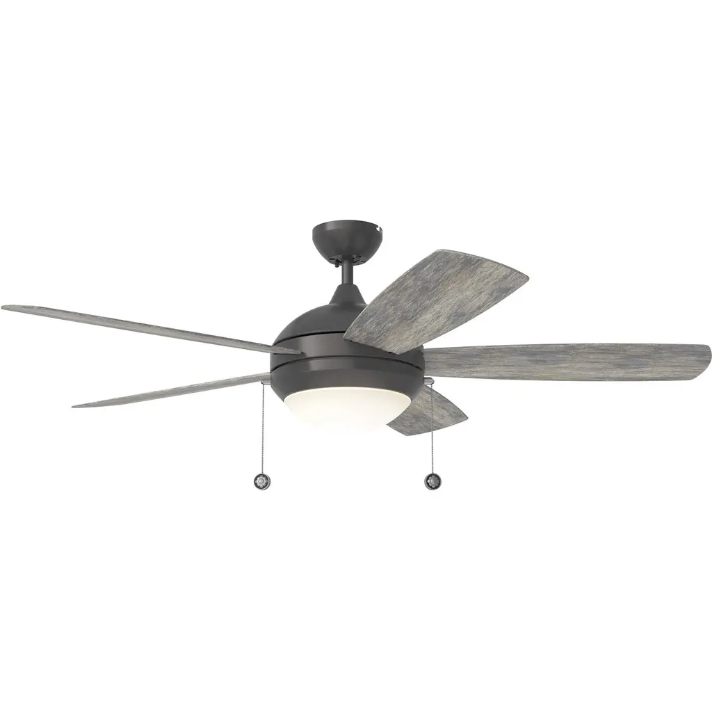 The Discus 52 LED in Aged Pewter features a 153.0 X 18.0 3-speed motor with a Twelve-degree blade pitch. With a minimalist, contemporary design and six color/finish options, the Discus 52 LED ceiling fan complements a wide variety of room styles. Discus features an integrated 20W LED downlight with a matte opal glass shade for functionality with flair. A pull chain controls this 3-speed fan, however a handheld or wall mount remote control is compatible and sold separately.