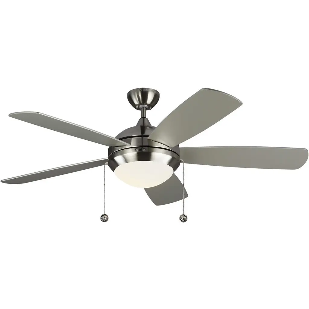The Discus 52 LED in Brushed Steel features a 153.0 X 18.0 3-speed motor with a Twelve-degree blade pitch. With a minimalist, contemporary design and six color/finish options, the Discus 52 LED ceiling fan complements a wide variety of room styles. Discus features an integrated 20W LED downlight with a matte opal glass shade for functionality with flair. A pull chain controls this 3-speed fan, however a handheld or wall mount remote control is compatible and sold separately.