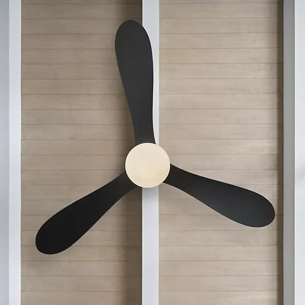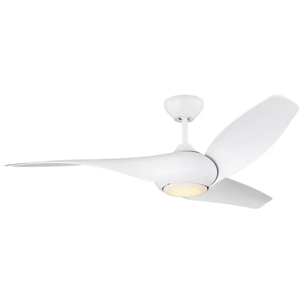 The Drape Smart LED Ceiling Fan from Visual Comfort Fan features a soft, light design that adds a graceful accent to any space it adorns. Designed by Peter Bristol, it showcases ultra-thin blades with gentle, curving, paddle-like shapes that delicately drape downward, helping create a peaceful atmosphere. An LED light at the center is covered by a polyethylene shade that diffuses light for a warm glow. It is damp-rated for indoor and outdoor use, and an app on one’s phone can control the light and fans, although a handheld remote is included as well.
