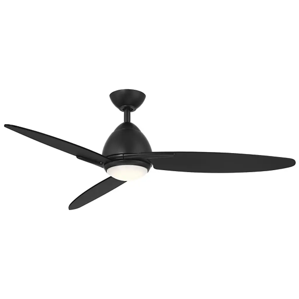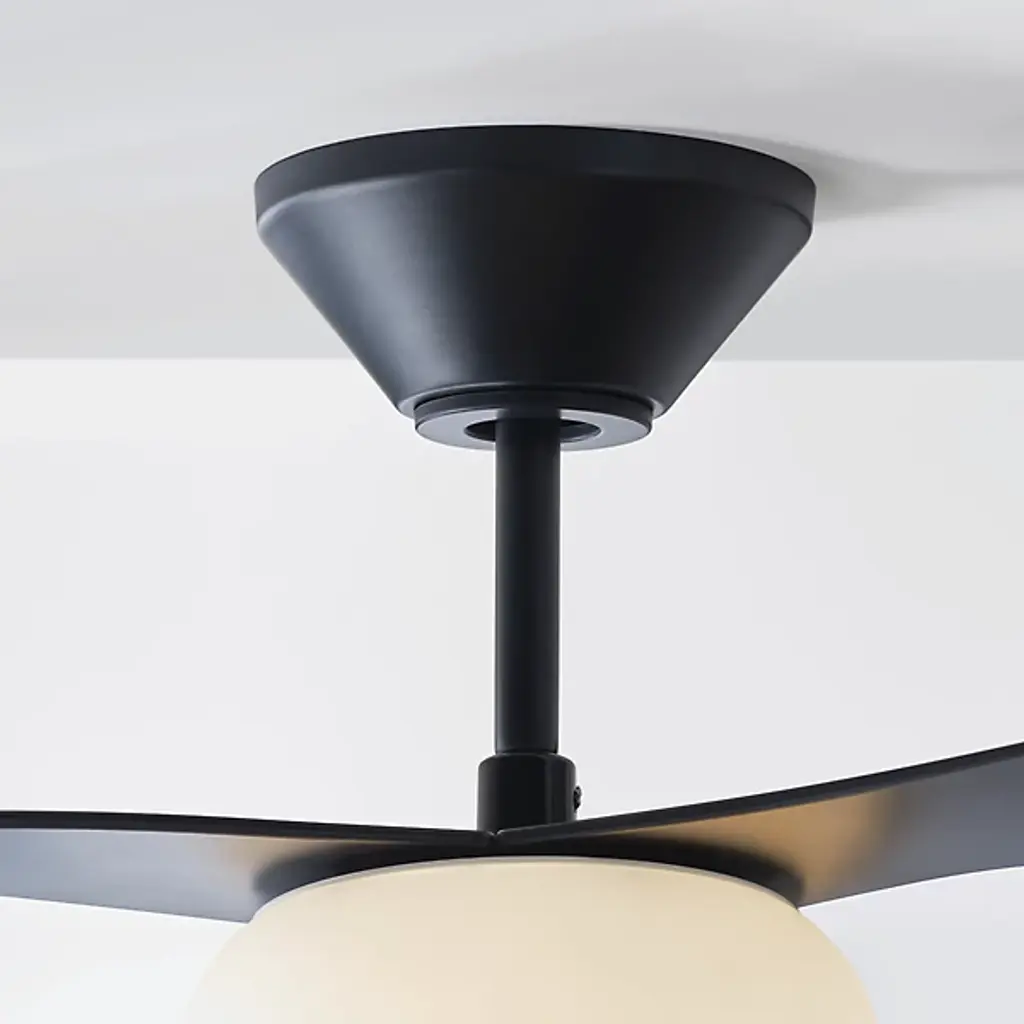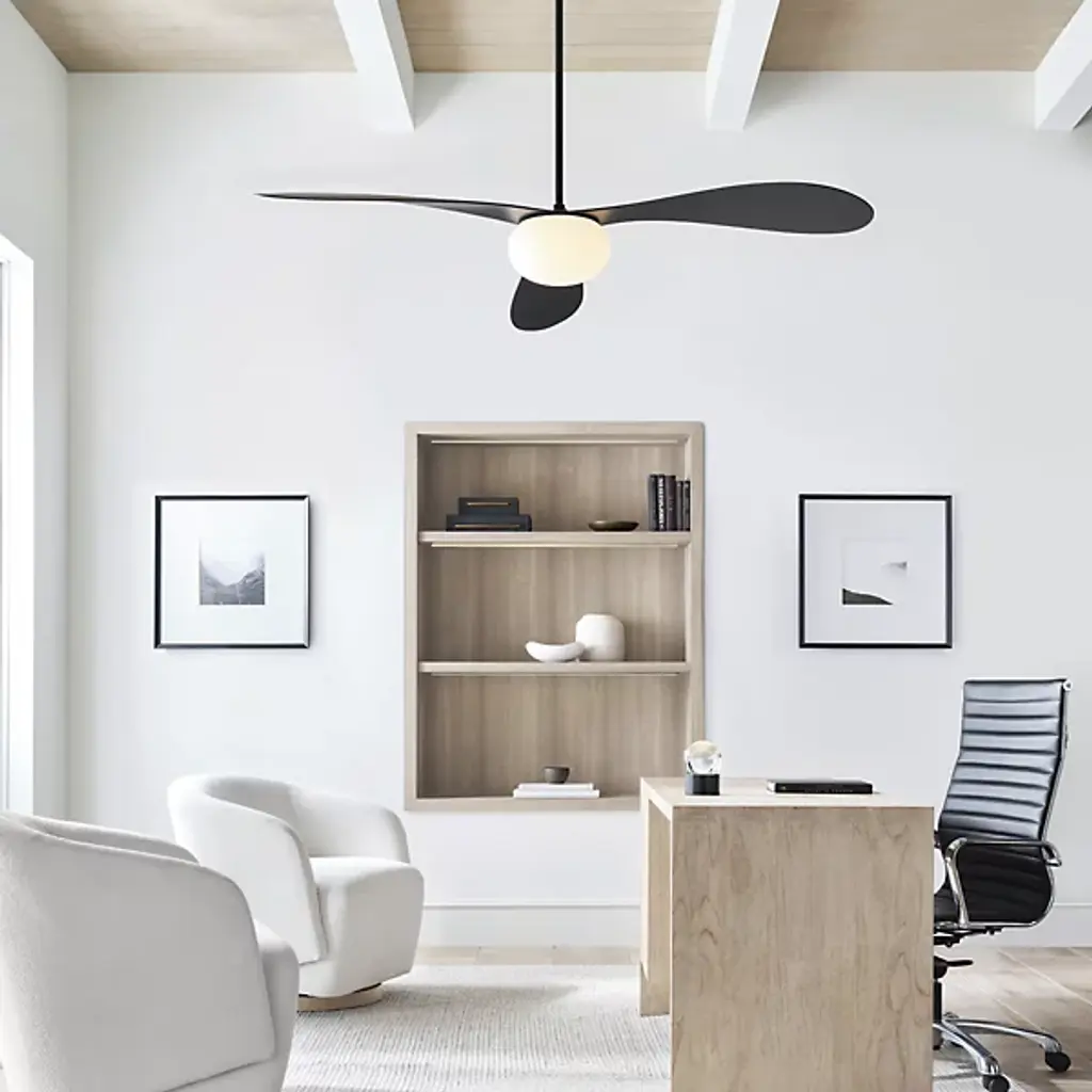 The Drape Smart LED Ceiling Fan from Visual Comfort Fan features a soft, light design that adds a graceful accent to any space it adorns. Designed by Peter Bristol, it showcases ultra-thin blades with gentle, curving, paddle-like shapes that delicately drape downward, helping create a peaceful atmosphere. An LED light at the center is covered by a polyethylene shade that diffuses light for a warm glow. It is damp-rated for indoor and outdoor use, and an app on one’s phone can control the light and fans, although a handheld remote is included as well.