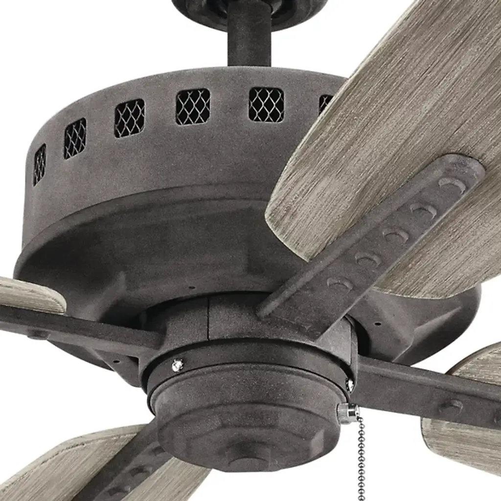 The Eads Patio Outdoor Ceiling Fan by Kichler is a handsome addition to spaces with an industrial look that finds itself at home in a wide range of covered patios and porches. The four blades span 65 inches and provide plenty of airflow, operating easily thanks to a traditional pull chain to create a comfortable environment all year long. A weathered finish completes these blades, and the body of the fan features some hardware detailing for a textured touch that gives this fan a casual feel.