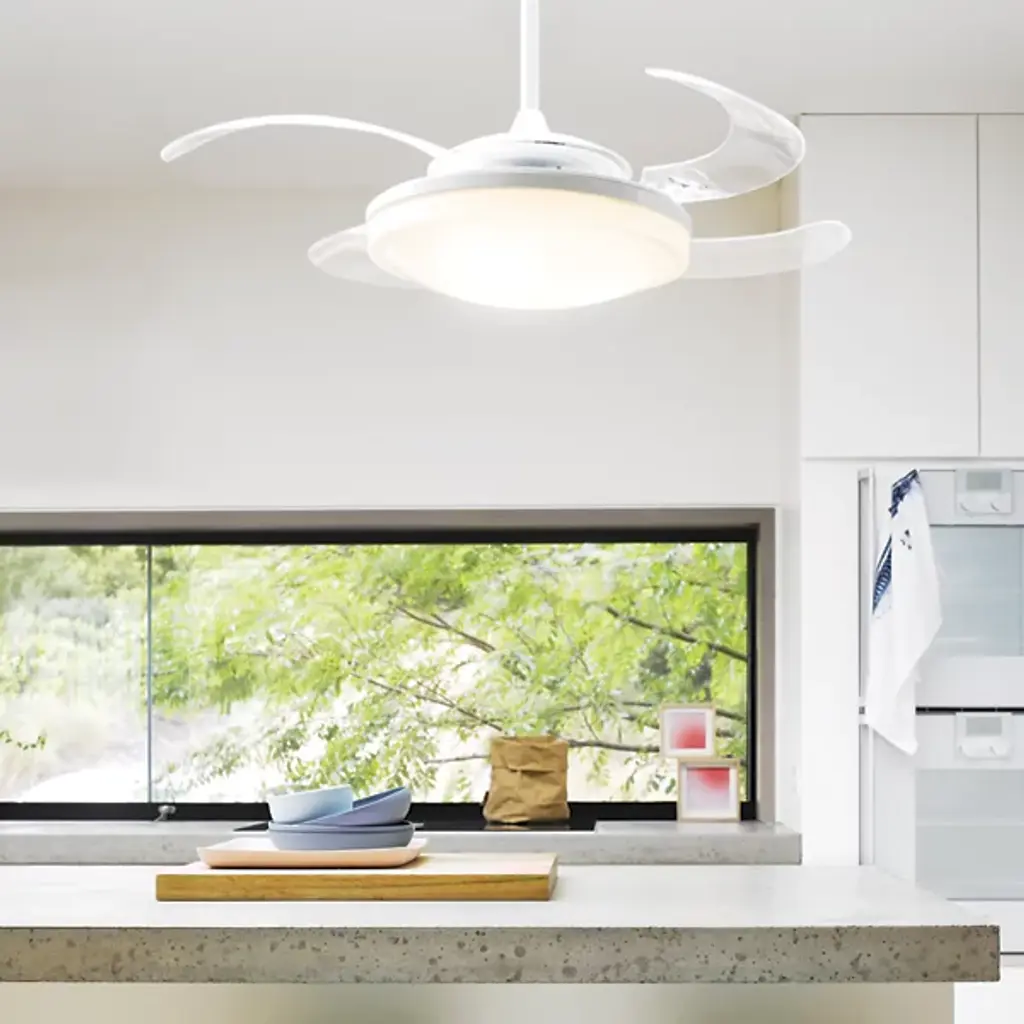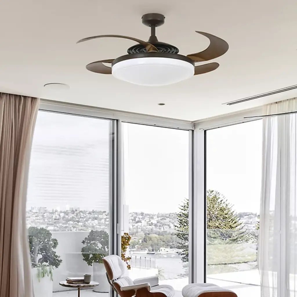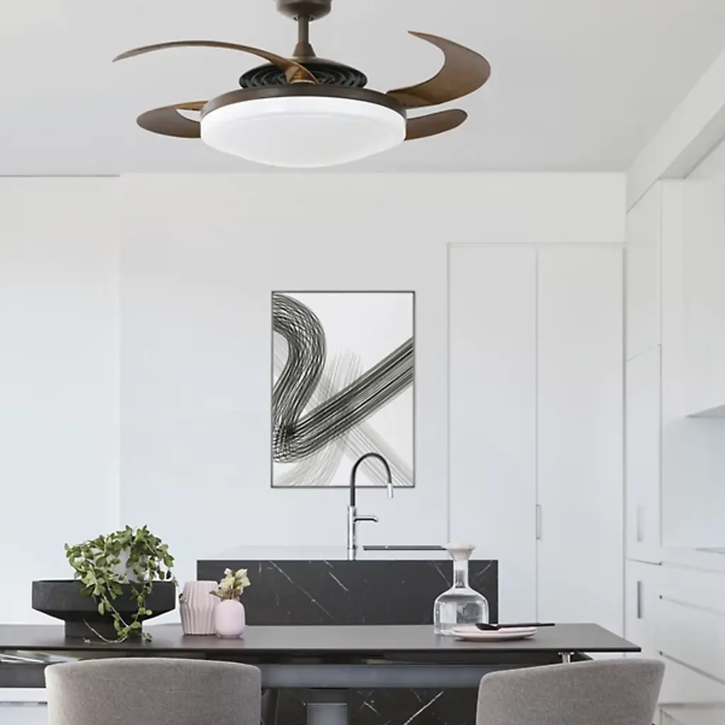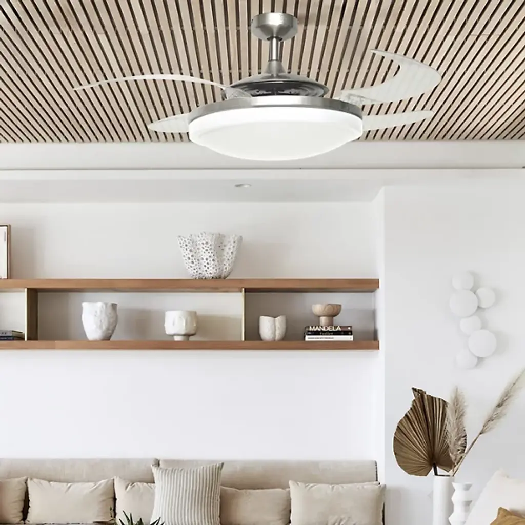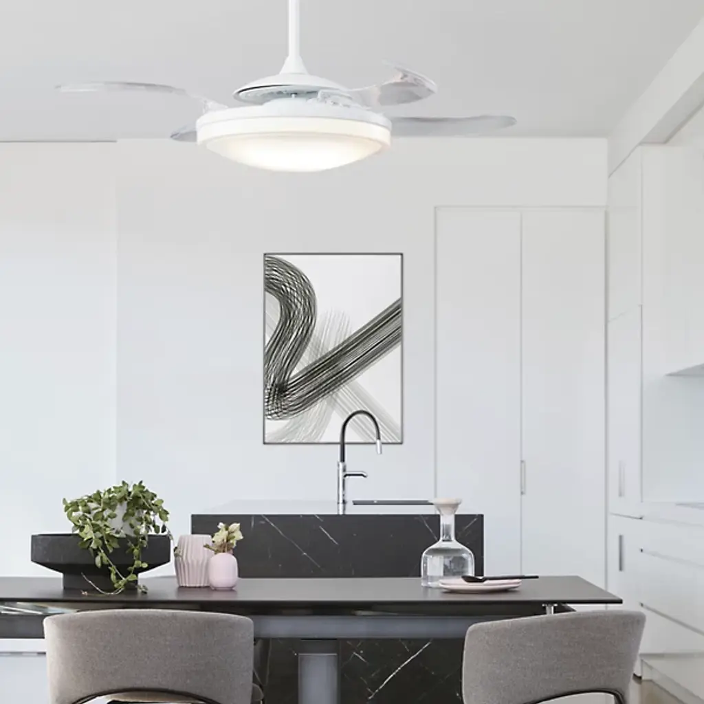 The ECO2 Fanaway Ceiling Fan from Beacon Lighting blends smart design with sleek style. Featuring retractable PC blades and a brushed chrome finish, it transforms from a modern light pendant into a powerful ceiling fan with the flick of a switch. When off, the blades tuck away, keeping your space open and dust-free. With an energy-efficient design, dimmable LED light kit, and remote control included, this fan offers quiet comfort, elegance, and versatility for any room.