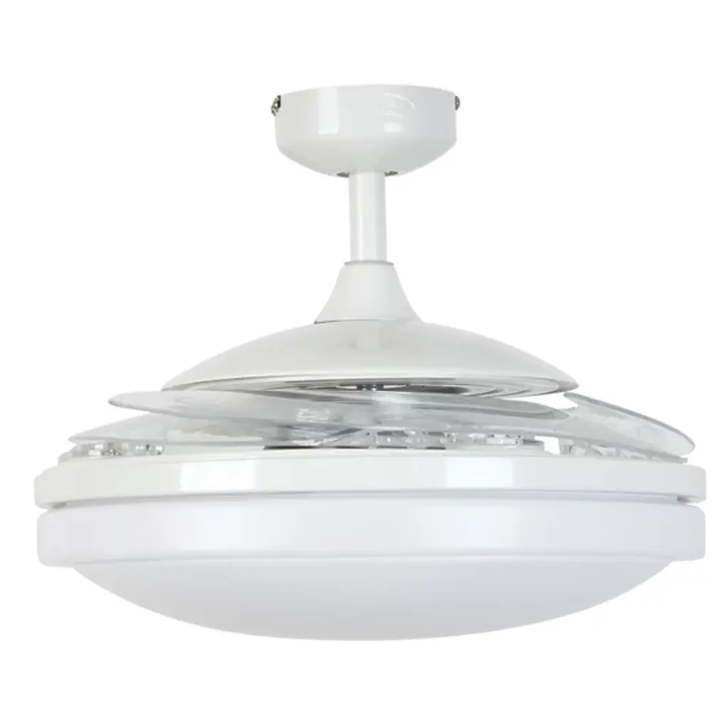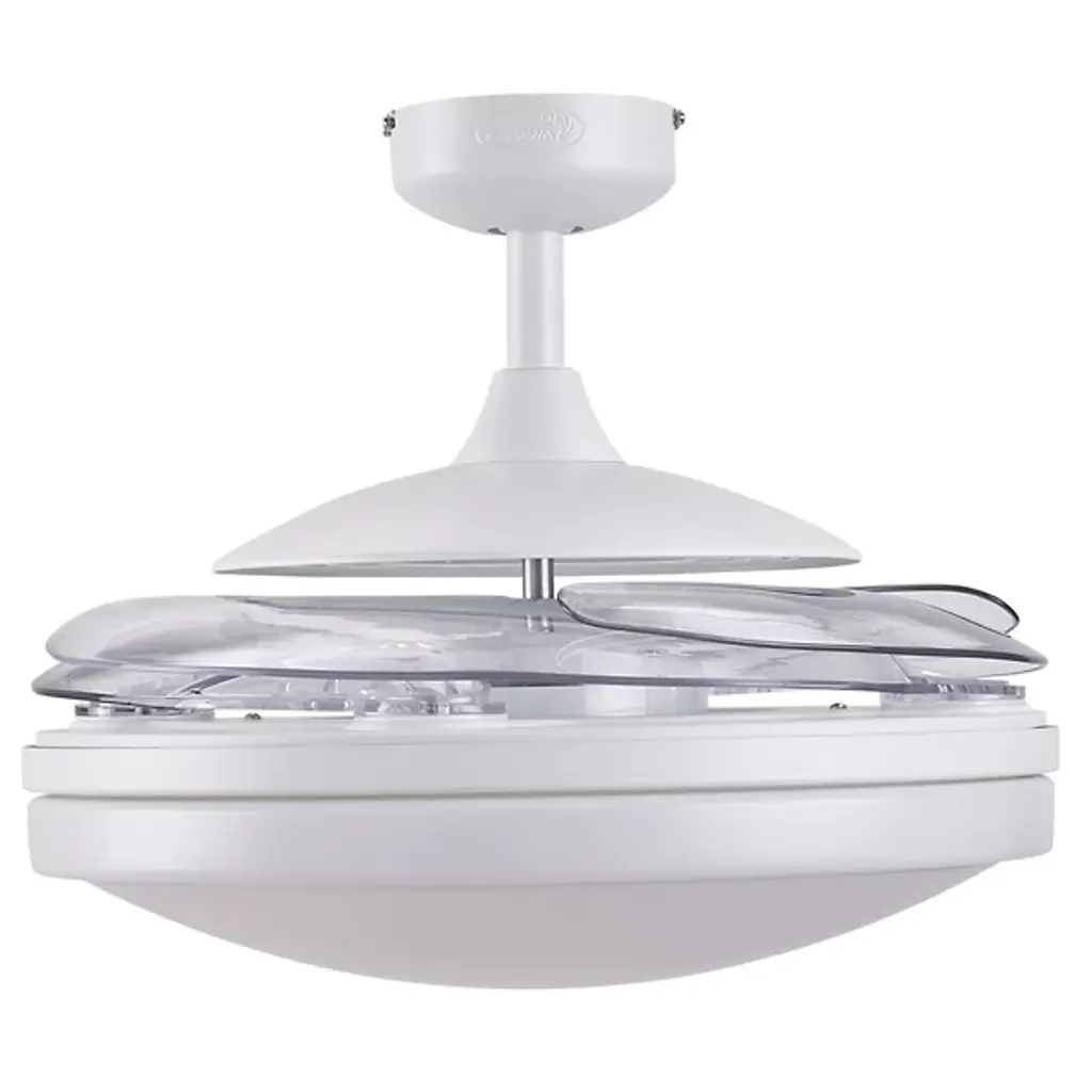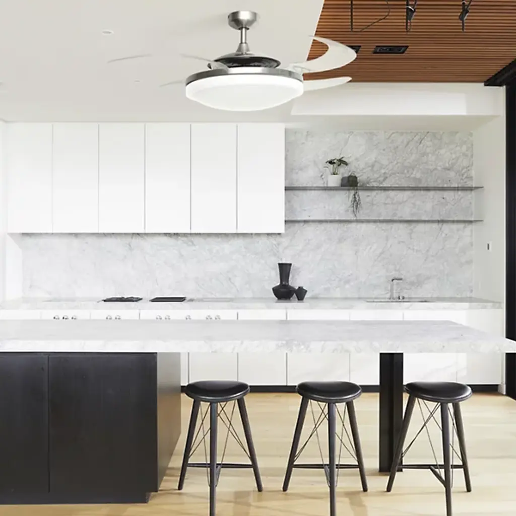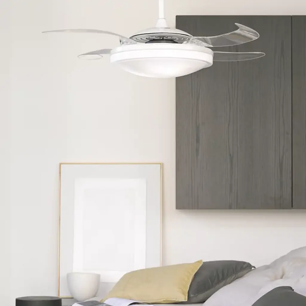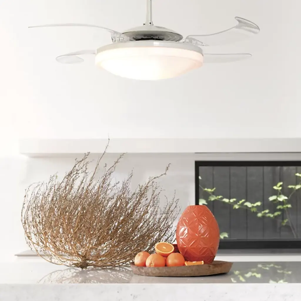 The ECO2 Fanaway Ceiling Fan from Beacon Lighting blends smart design with sleek style. Featuring retractable PC blades and a brushed chrome finish, it transforms from a modern light pendant into a powerful ceiling fan with the flick of a switch. When off, the blades tuck away, keeping your space open and dust-free. With an energy-efficient design, dimmable LED light kit, and remote control included, this fan offers quiet comfort, elegance, and versatility for any room.