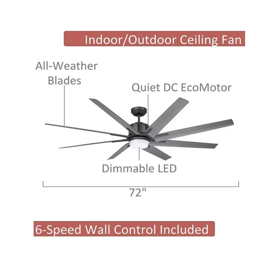 Emerson Aira Eco 72" Outdoor Damp Graphite Ceiling Fan LED Light - All-Weather Driftwood Blades The Emerson Aira Eco 72" ceiling fan offers powerful airflow and quiet operation, making it perfect for large indoor spaces. Its contemporary design features a brushed steel finish paired with durable driftwood blades, ideal for both indoor and damp locations. Key Features: LARGE CEILING FAN WITH QUIET DC MOTOR: This big ceiling fan delivers superior airflow with its 72-inch blade span, 15-degree blade pitch, and state-of-the-art EcoMotor that runs more quietly, efficiently, and cooler than standard ceiling fans. CONTEMPORARY INDOOR CEILING FAN: Its sturdy metal construction boasts a brushed steel finish that is perfectly complemented with 8 walnut blades. Damp rated for indoor use and makes an ideal living room ceiling fan. DIMMABLE LED LIGHT FIXTURE: Designed with an integrated LED light. The opal matte glass shade is removable so you can switch between lighted and fan-only options. This LED ceiling fan also comes with a 6-inch downrod for installation. INCLUDES 6-SPEED WALL CONTROL: This ceiling fan kit comes with a 6-speed wall control with receiver for simple operation so you can easily select your fan speed, light intensity, and airflow direction for the optimum comfort level.