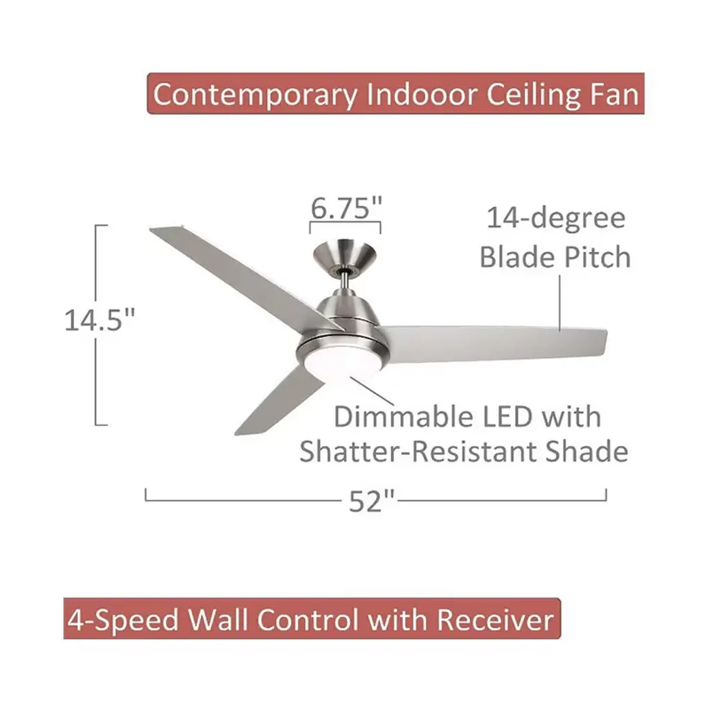 Emerson CF370BS Geode 52" Ceiling Fan with LED Light, Brushed Steel This contemporary 52-inch ceiling fan features a sleek three-blade design and integrated dimmable LED light, ideal for bedrooms, living rooms, or offices. With a brushed steel finish and included 4-speed wall control, it delivers both style and function in dry-rated indoor spaces. Key Features: • 52 inch indoor ceiling fan – rated for dry locations • LED ceiling fan with dimmable light and shatter-resistant acrylic shade • Includes 4-speed wall control with receiver – range up to 30 feet • Contemporary 3 blade design with 14-degree blade pitch • Hanging ceiling fan with downrod mount – includes 4.5" downrod • Ceiling fan measures 14.5 inches high overall