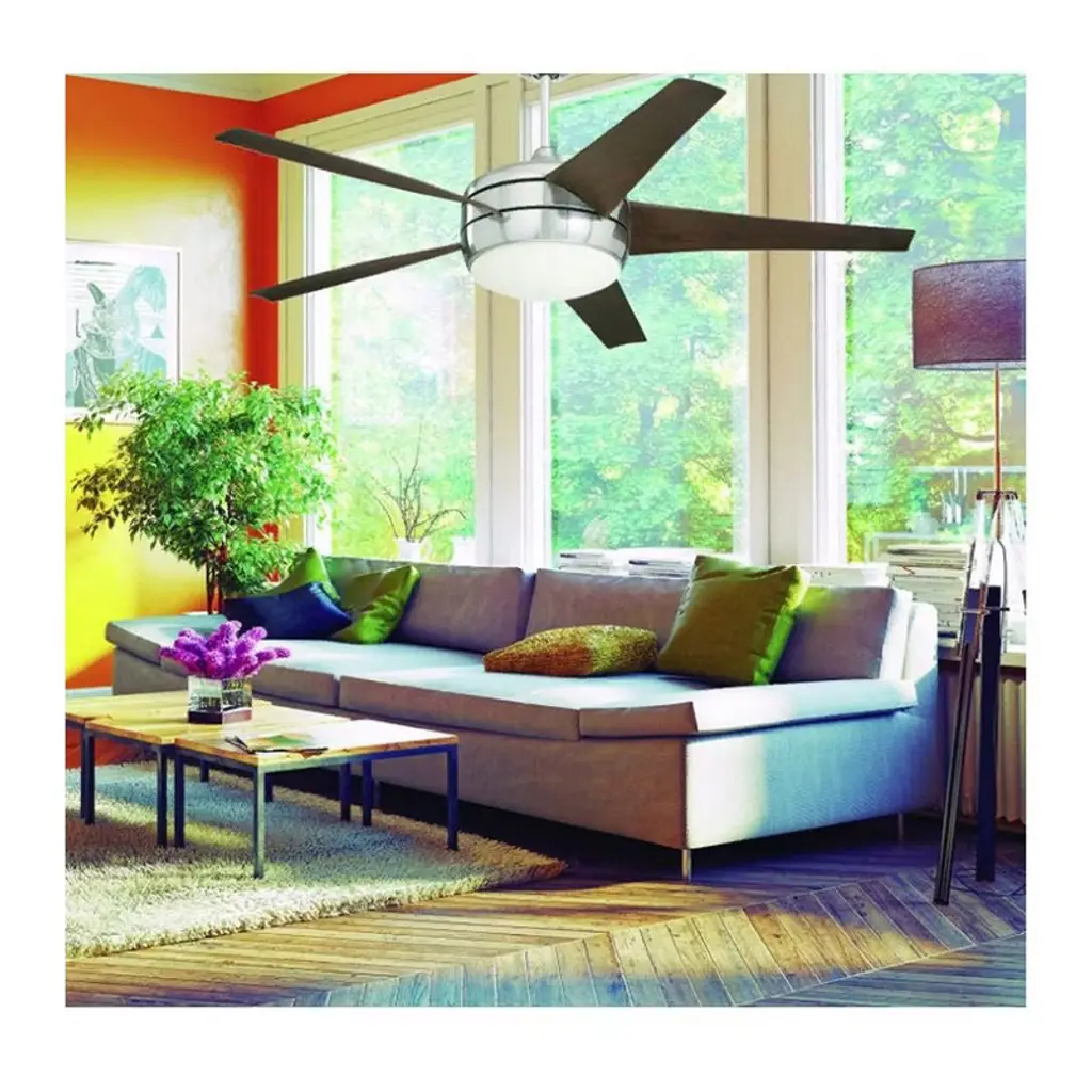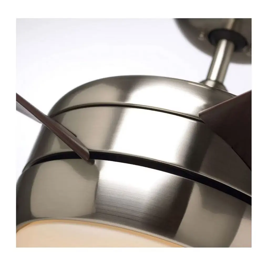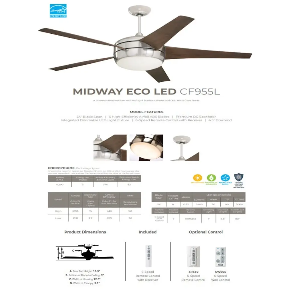 Emerson Midway Eco 54" Ceiling Fan with LED Lights & Remote, Brushed Steel with Midnight Bordeaux Blades Designed for maximum efficiency and elegant style, the Midway Eco features Emerson's powerful EcoMotor and integrated LED lighting. Its aerodynamic blades and sleek finish make it a standout in energy-saving performance. Key Features: • 54" fan with EcoMotor – uses up to 75% less energy • Energy Star rated for superior efficiency and cost savings • Integrated LED light with opal matte glass • Aerodynamic airfoil blades with 29° pitch for 40% more airflow • Stylish brushed steel housing with Midnight Bordeaux blades • Includes 6-speed LED remote control with reverse and dimming functions