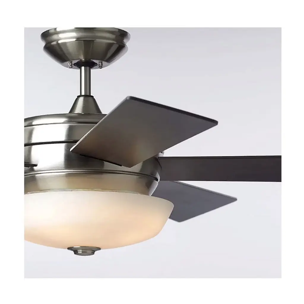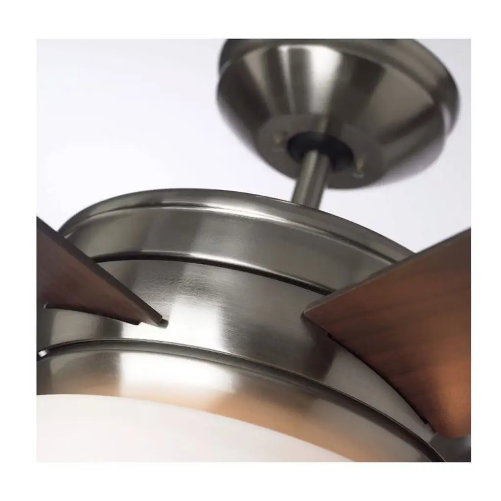Emerson Cronley 54 Inch Ceiling Fan with Light Fixture and Remote, Brushed Steel This 54-inch ceiling fan combines classic design with powerful airflow, featuring a reversible motor and five dark cherry blades for year-round comfort. The integrated light kit with opal matte glass provides warm illumination, while the included wall control makes speed and light adjustments effortless. Key Features: • Large ceiling fan with quiet motor – ideal for standard to large-sized rooms • Dimmable with integrated light kit – includes opal matte glass shade and 4x 13W E26 bulbs • Classic fan with durable build – brushed steel finish with dark cherry blades • Includes 4-speed wall control with receiver – manage fan speed, light intensity, and airflow direction • Includes 4.5-inch downrod for standard installation
