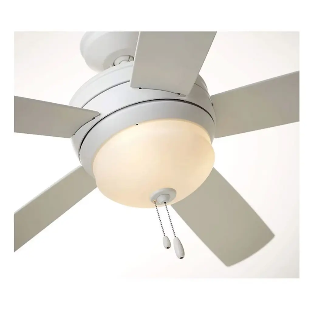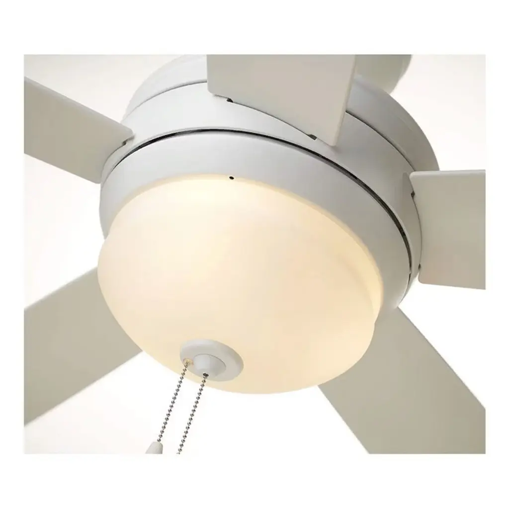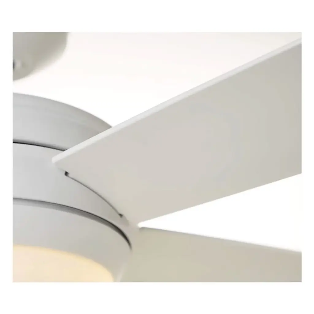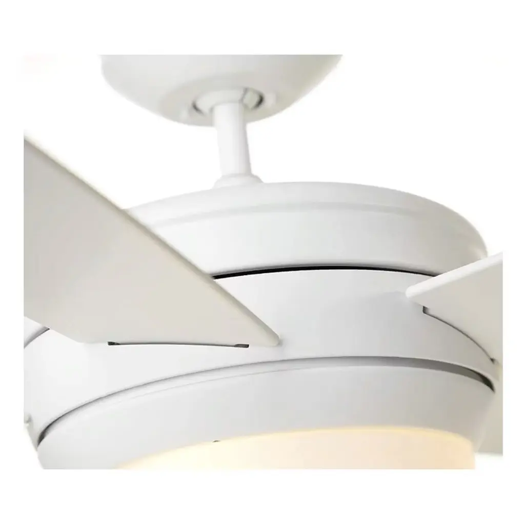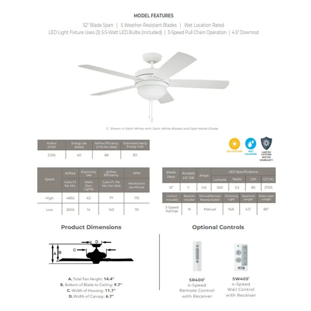 Emerson Summerhaven 52" Outdoor Wet-Rated Ceiling Fan with LED Light, Satin White Designed to handle the elements, the Emerson Summerhaven 52" ceiling fan is perfect for patios, porches, and other outdoor spaces. With weather-resistant satin white blades and a wet-rated construction, this fan delivers powerful airflow and reliable performance. The integrated LED light fixture with opal matte glass adds both style and functionality, while the pull chain operation offers simple manual control. Key Features: • 52" blade span with 5 all-weather satin white blades • Wet-rated for outdoor use in exposed locations • Integrated light fixture with three 5.5W candelabra-base LED bulbs • Opal matte glass shade for soft, diffused light • Durable satin white metal housing • Pull chain operation for fan speed and lighting • Manual reverse switch for seasonal airflow adjustment • Includes 4.5" downrod for hanging installation Specifications: • Model Number: CF850SW • Manufacturer: Luminance • Color/Finish: Satin White • Blade Material: All-weather ABS • Bulb Type: LED • Wattage: 63W total • Mounting Type: Hanging, ceiling mount, wall mount • Control Type: Pull chain • Dimensions: 24.76" L x 13.66" W x 10.79" H (packaged) • Weight: 23.8 lbs • Country of Origin: China • Indoor/Outdoor: Wet-rated for outdoor use