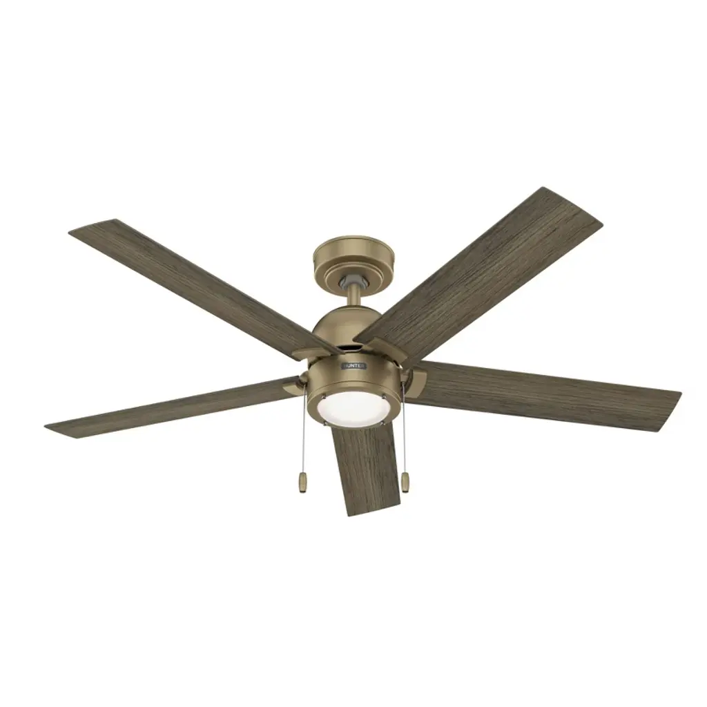 Handsome looks and inviting functionality underscore the Erling LED Ceiling Fan from Hunter Fans. The piece's clean outlines and materials complement a range of home styles. Its powerful engine delivers energy with a whisper-quiet, low-wobble operation. The engine provides a trio of speed settings and reversible functionality. Its housing cover features a clean round shape with sharp angular blades radiating from it. The blades move swiftly for enhanced comfort. This piece turns on with a pull-chain setup.