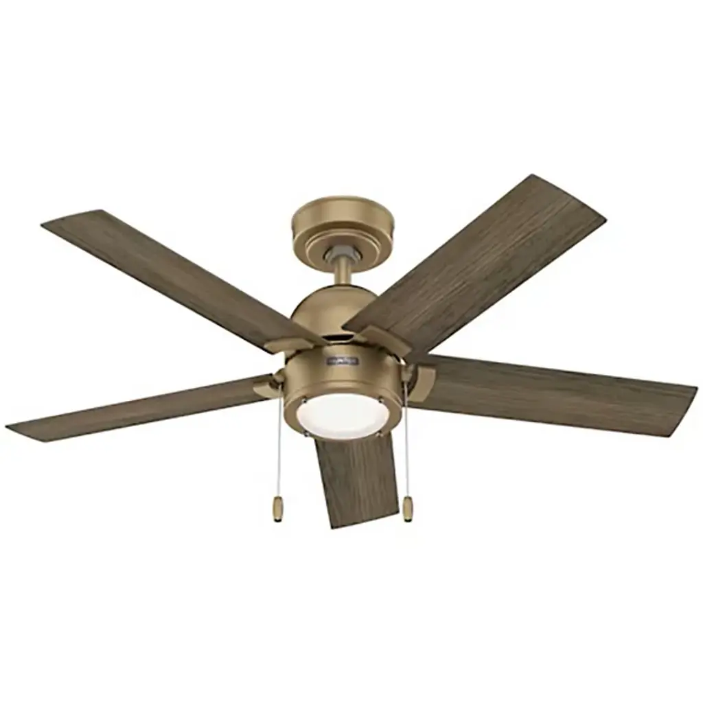 Handsome looks and inviting functionality underscore the Erling LED Ceiling Fan from Hunter Fans. The piece's clean outlines and materials complement a range of home styles. Its powerful engine delivers energy with a whisper-quiet, low-wobble operation. The engine provides a trio of speed settings and reversible functionality. Its housing cover features a clean round shape with sharp angular blades radiating from it. The blades move swiftly for enhanced comfort. This piece turns on with a pull-chain setup.