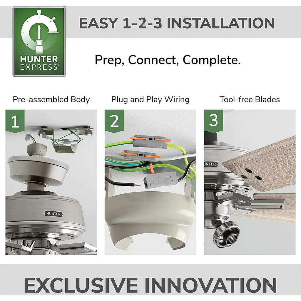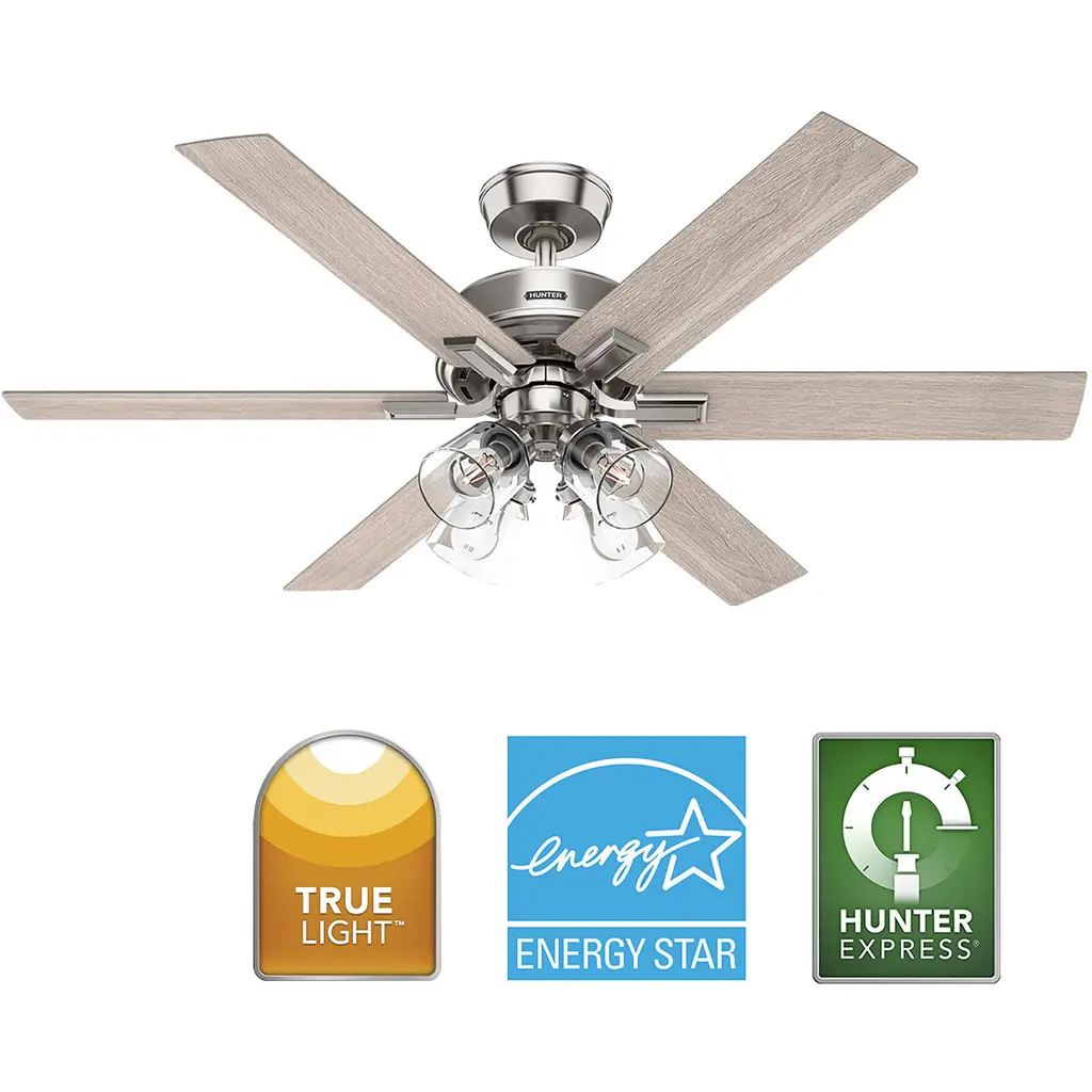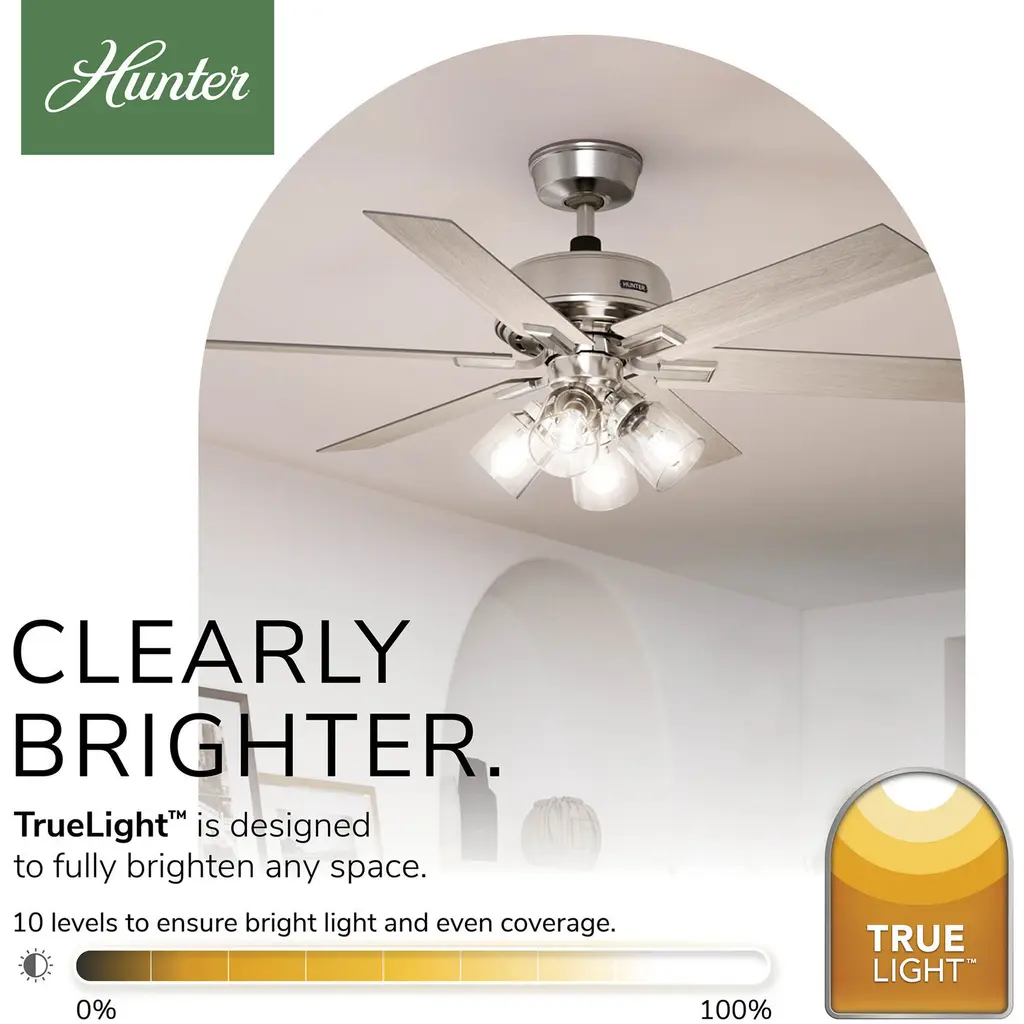 Climb the hill of ultimate comfort with the Fonthill ENERGY STAR Ceiling Fan, perfect for any room with its casual design. Featuring a reversible, 6-speed DC motor, it ensures efficient, quiet operation. Control speed and lighting with ease using the included handheld remote. TrueLight technology ensures a bright balance of clear and welcoming light in every room. The Fonthill fan is 64% more efficient than conventional fans, saving on cooling costs. Ideal for bedrooms and living rooms this energy-efficient fan enhances style and comfort. Plus, HunterExpress fans offer easy 1-2-3 installation with a pre-assembled body, plug & play wiring, and easy-install blades.