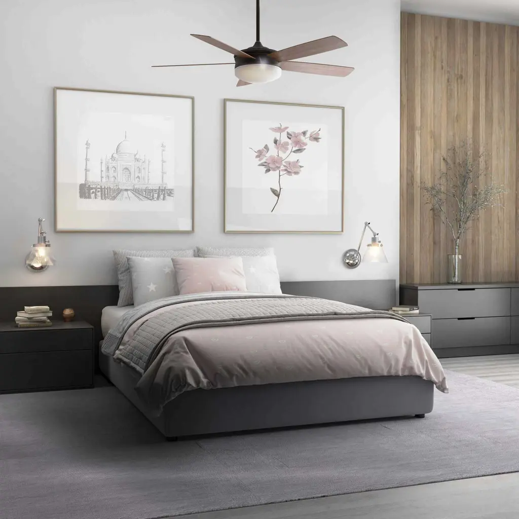 Five-blade 60 inch Fresno ceiling fan features with reversible blades in cherry and dark walnut. The LED light source offers both form and function with energy- and cost-savings benefits. A white opal glass shade features an 18W dimmable, 3000K LED module. Full range dimming and remote control with batteries is included. Featuring reversible blades, the fan has a Brushed Nickel finish.