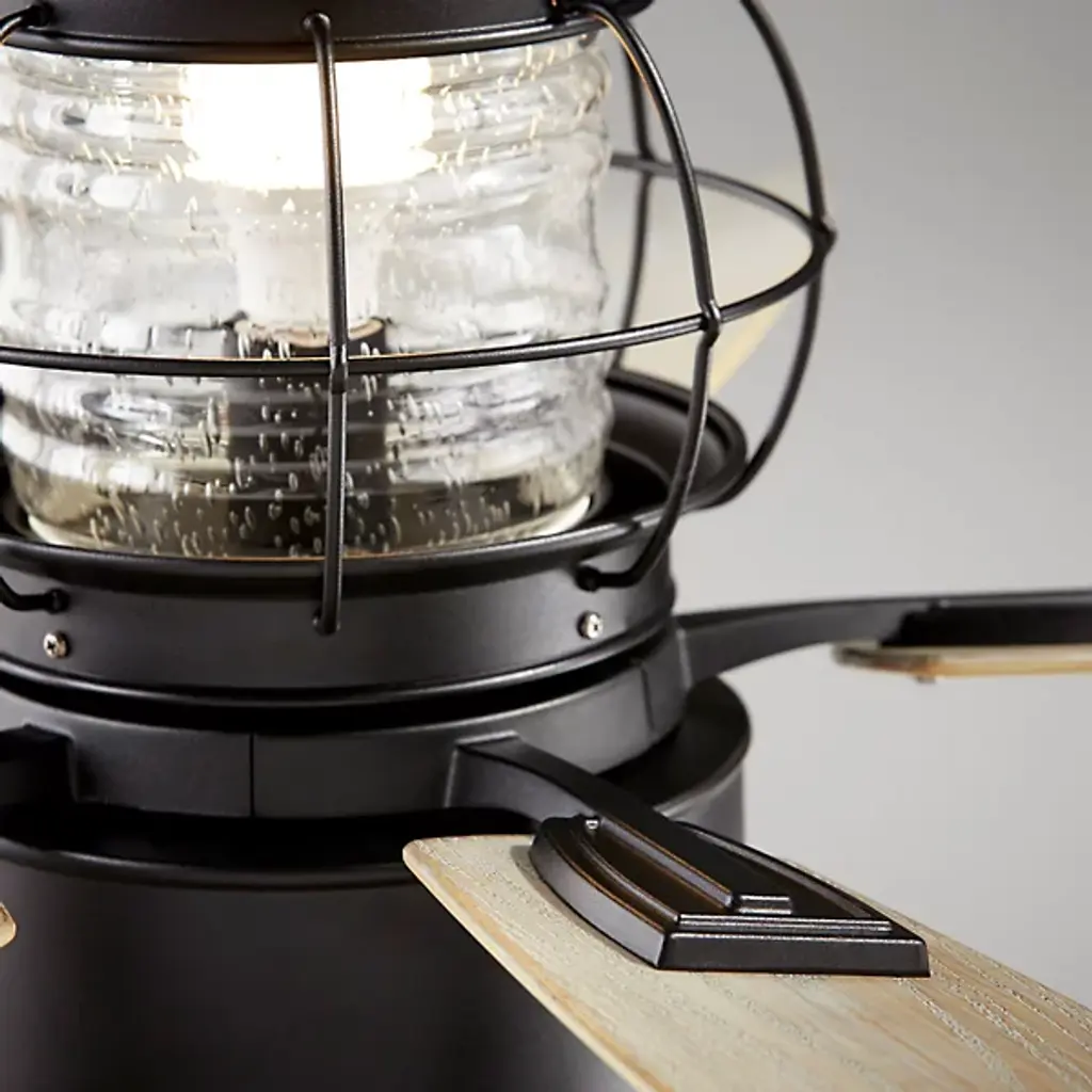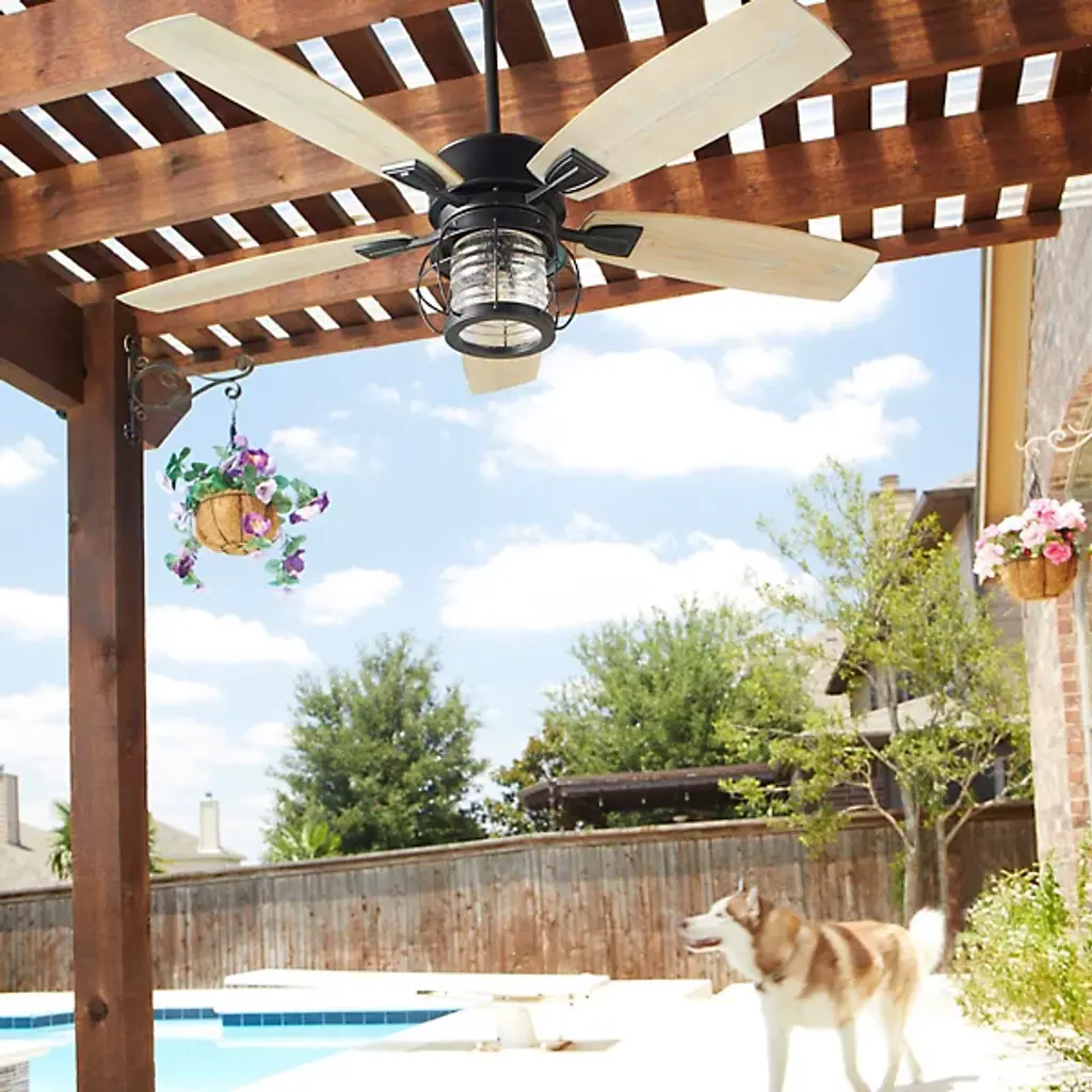 Bring wide-wafting comfort to your inside living spaces with the Galveston Patio Outdoor Ceiling Fan from Quorum International. A robust transitional fixture, it sweeps down from above along a slender stem, using a rounded housing to hold both the fan’s motor and seat a single socket in a ripple-surfaced cylinder shade surrounded by a wire structure that calls to mind a traditional lantern. This mellows bright glare from the sides, casting a focused pool of light below the five curve-ended blades.