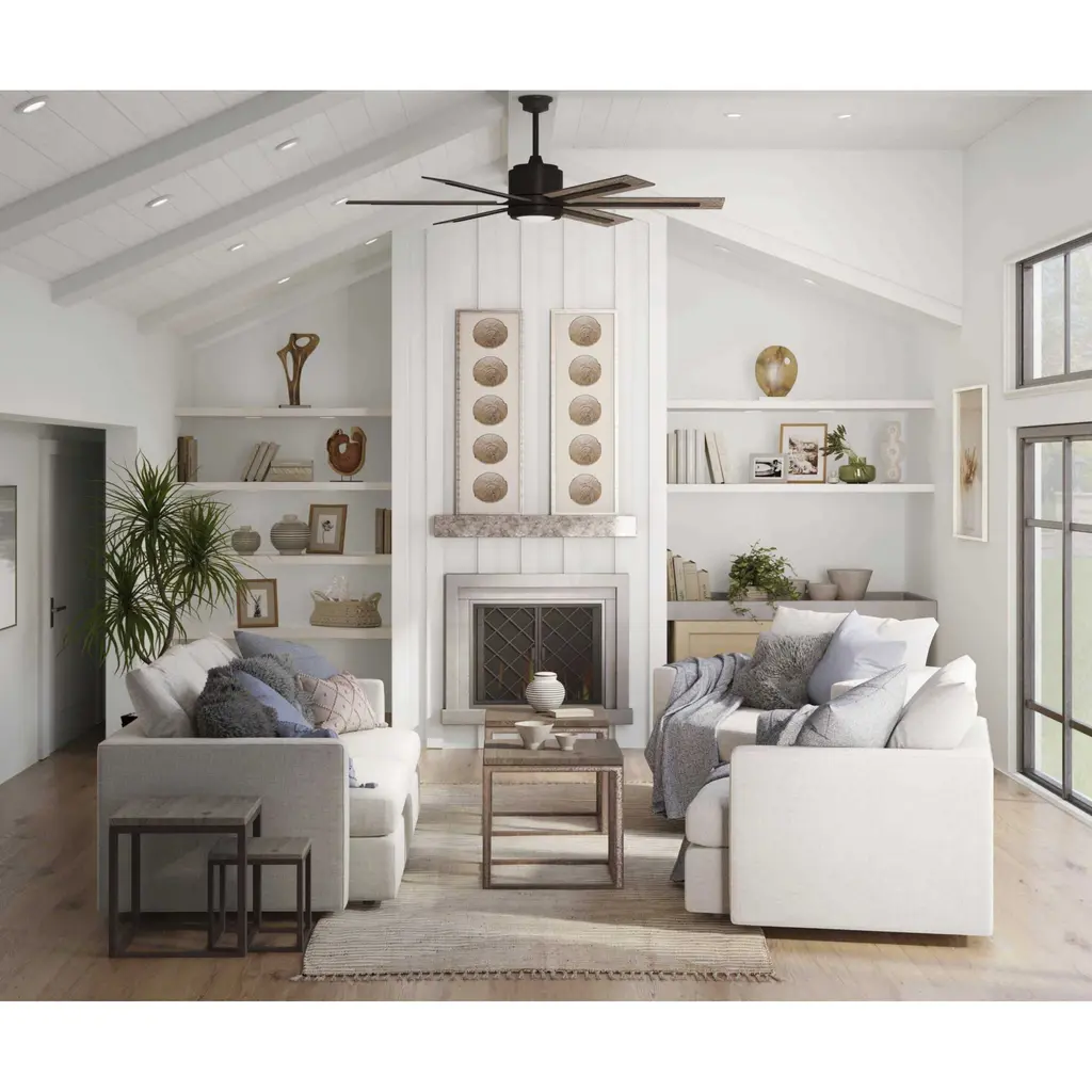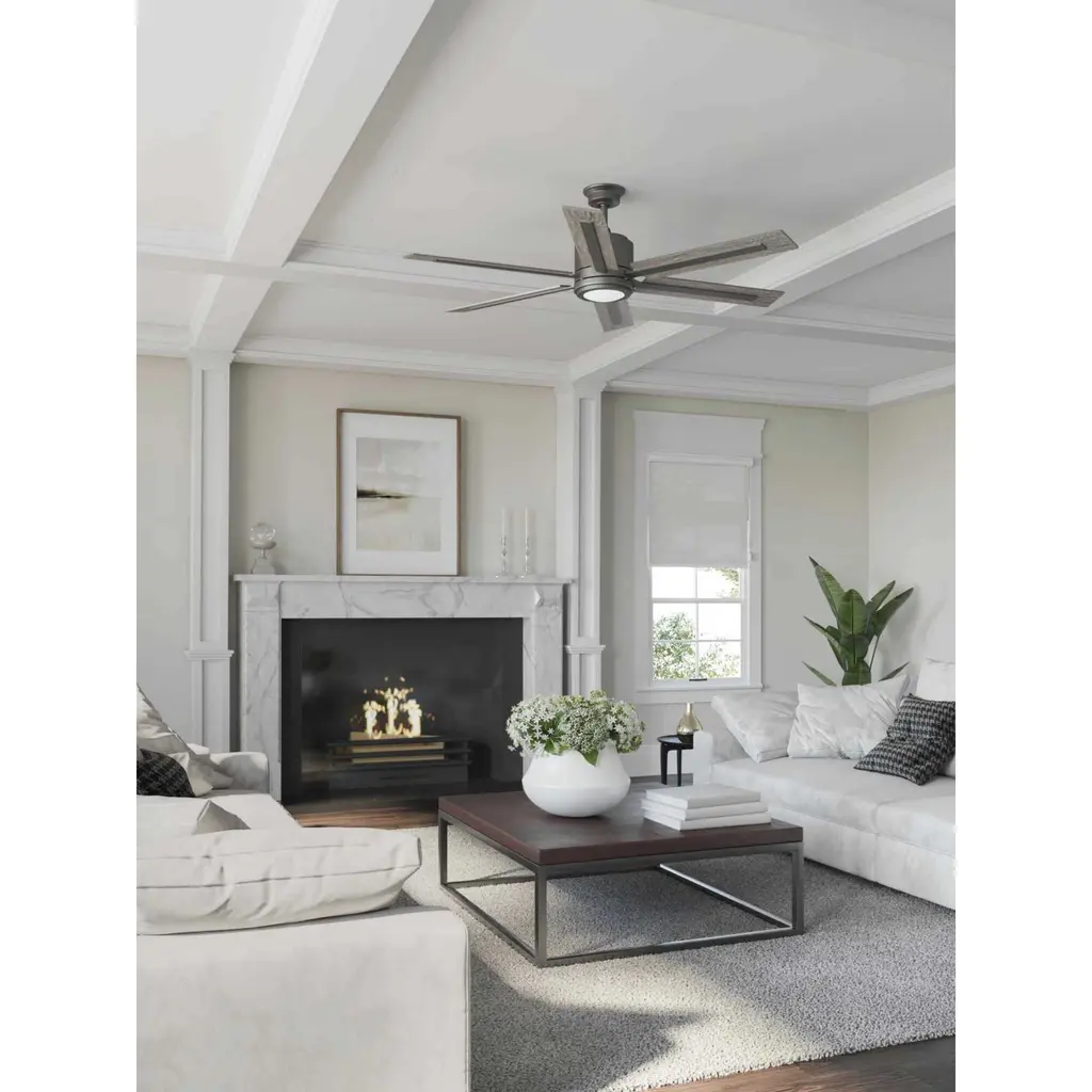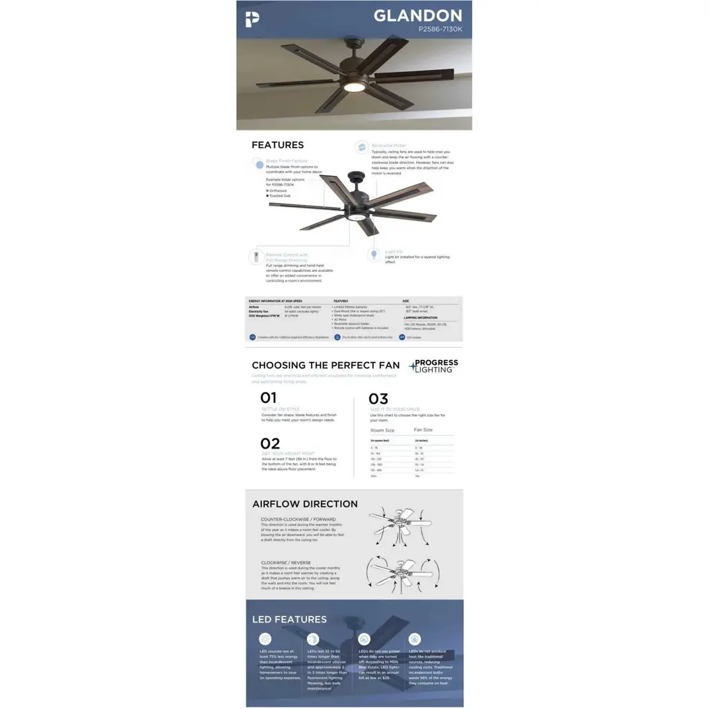 The 60 inch Glandon ceiling fan features a 17W LED module (3000K color temperature) with a shatterproof white opal shade. With a sophisticated and modern design, Glandon has a dual mount system and comes with a hand held 3-speed remote control with full range dimming is included. It comes with reversible blades in driftwood and toasted oak.