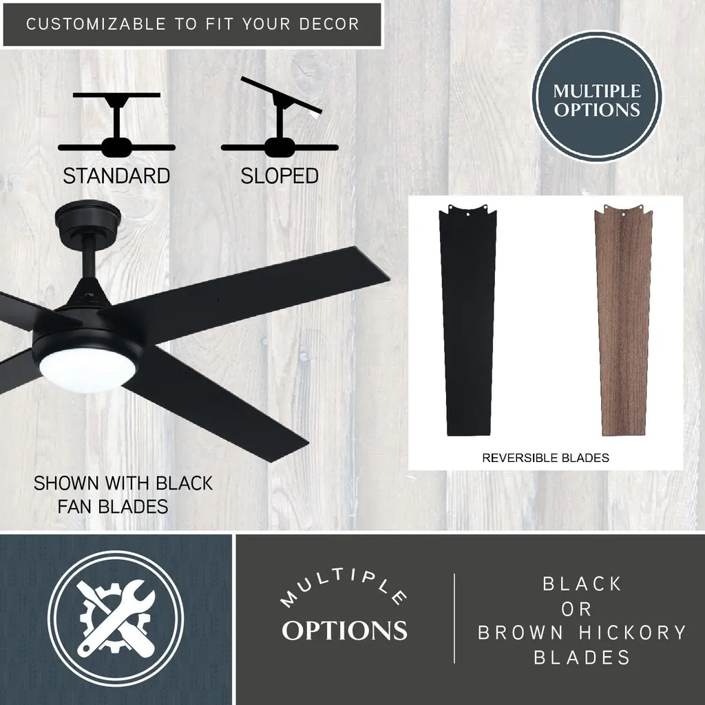 Introducing the Hamlin 52-in. ceiling fan: a modern interpretation of rustic windmill design, perfect for transitional and contemporary interiors. Featuring reversible blades in black or brown hickory that complement a sleek black motor housing, this fan adds style and functionality to any indoor space. With integrated LED lighting, three-speed fan control, and remote dimming capabilities, the Hamlin offers both ambiance and comfort. Backed by safety certifications and a lifetime limited warranty for peace of mind.