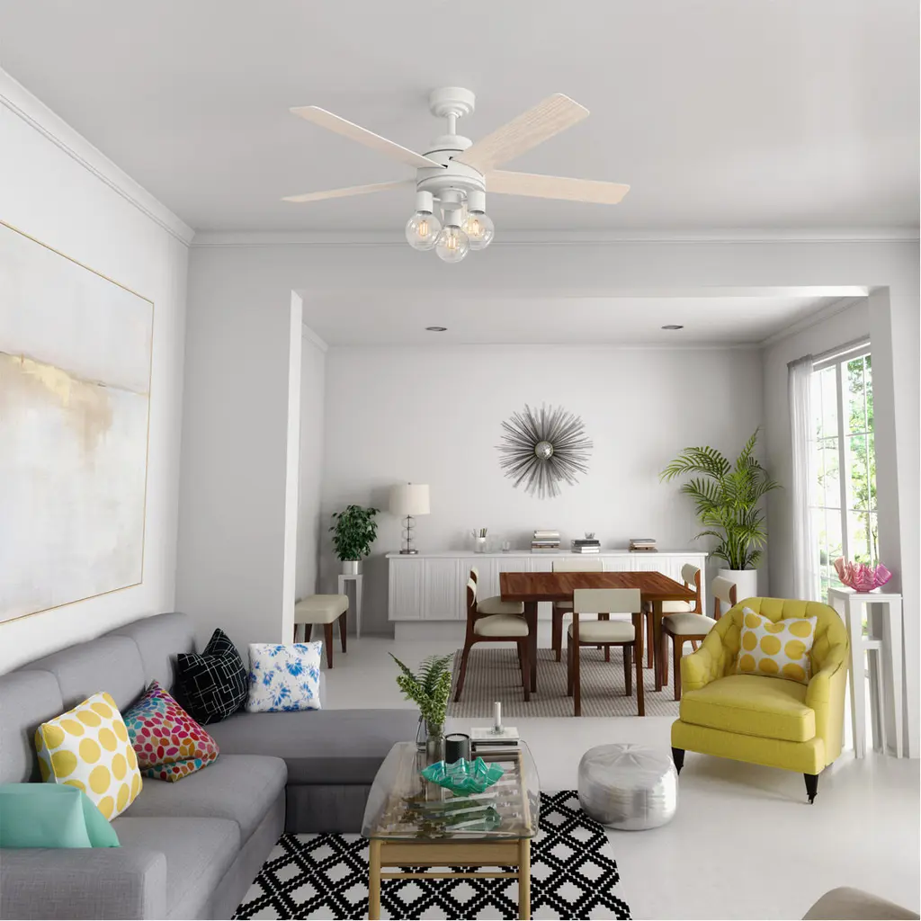 The Hardwick ceiling fan with light is a modern take on ceiling fan design. It combines simple, clean lines and a traditional light fixture with unique globe Edison bulbs for a fresh look. The Matte Nickel and Fresh White finishes add a subtle statement in casual rooms while Matte Black finish complements dark hardware and accents in modern industrial and farmhouse spaces. It’s 52-inch blade span makes it an ideal fit in large rooms like bedrooms, living rooms, and bonus rooms.