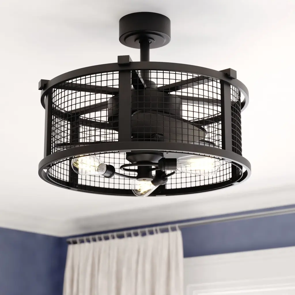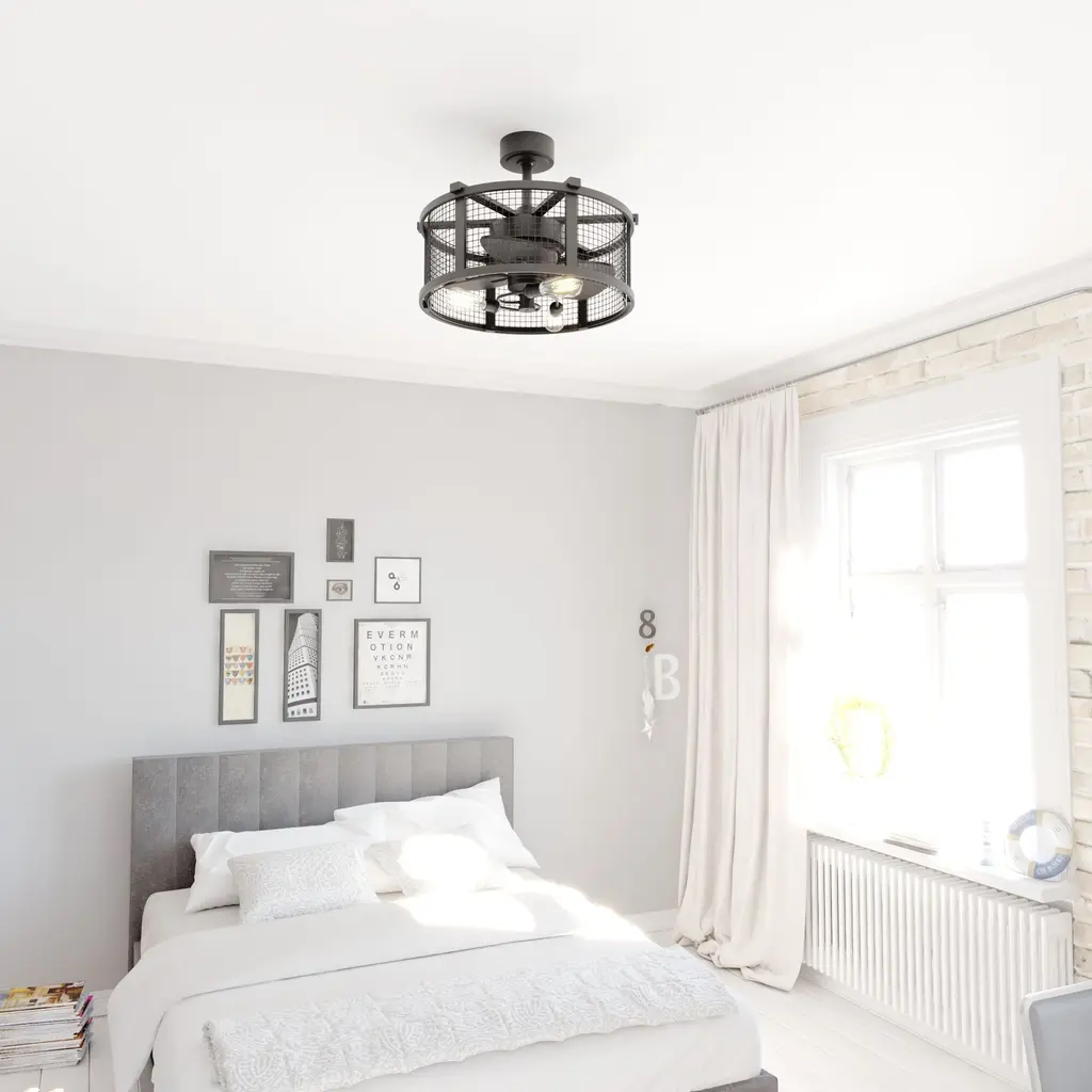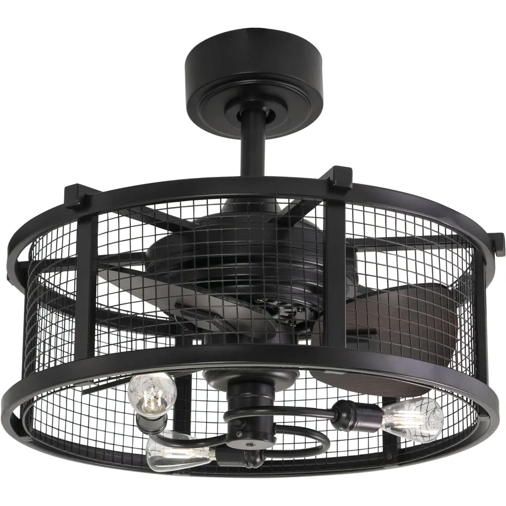 This drum style ceiling fan called Humboldt offers 360 degrees of soft industrial inspired beauty and comfort. Black finish frame and versatile reversible blades handsomely accent the metal mesh cage. This beautiful yet functional design is the perfect addition for your edgy industrial style. Add it to any bedroom, hallway, living or dining areas. This fan is compatible with sloped ceilings and includes a 6 inch down rod (longer down rods sold separately). Remote control included for added convenience.