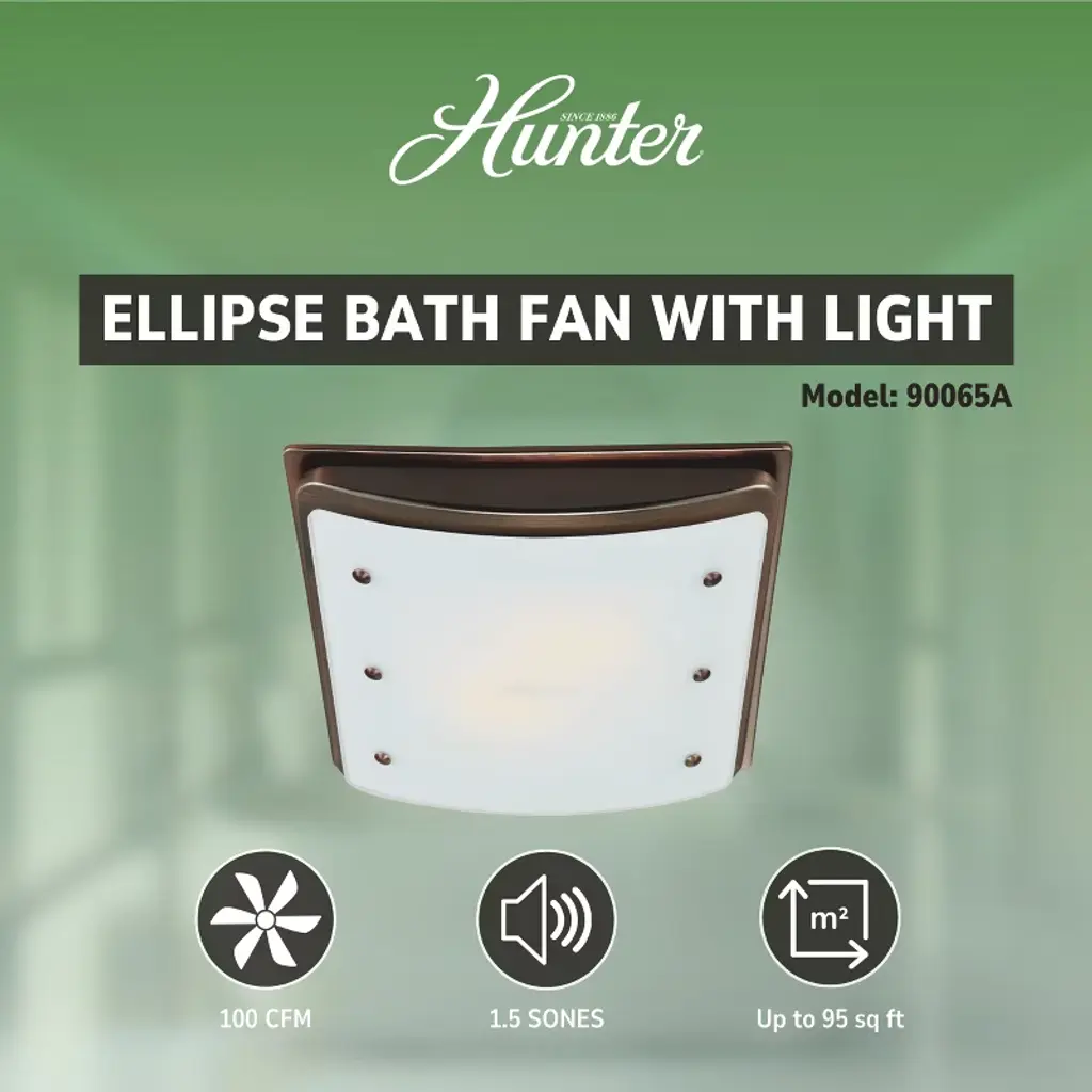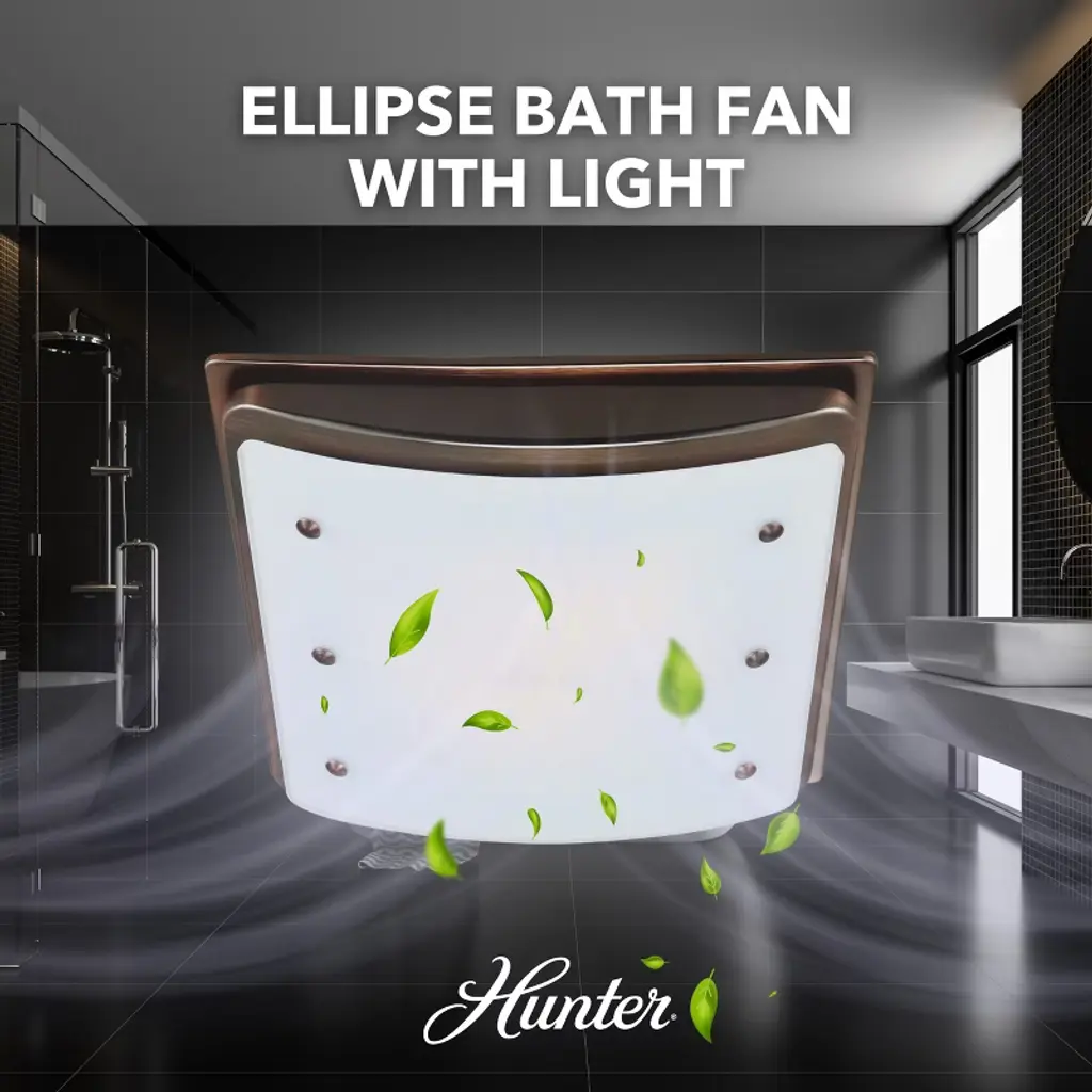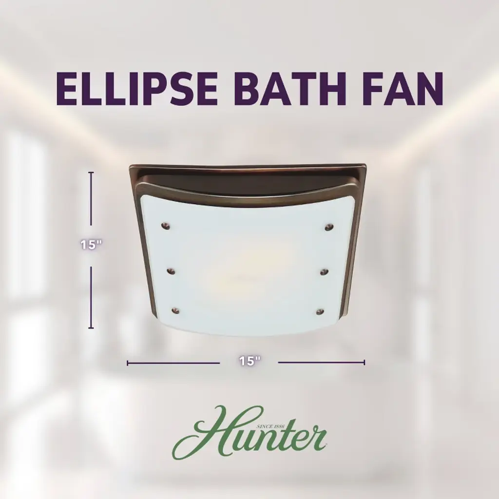 Elevate your bathroom with the Hunter Ellipse 100 CFM Bathroom Exhaust Fan in an elegant Bronze finish with frosted glass. This versatile bathroom fan not only reduces excess moisture and humidity with its 100 CFM of air movement but also operates at an ultra-quiet 1.5 sones, ensuring a peaceful environment for your daily routines. The flush mount design adds a touch of sophistication, making it a stylish addition to any bathroom decor. The Hunter exhaust fan also fights odors and circulates air, improving the overall air quality in your bathroom.