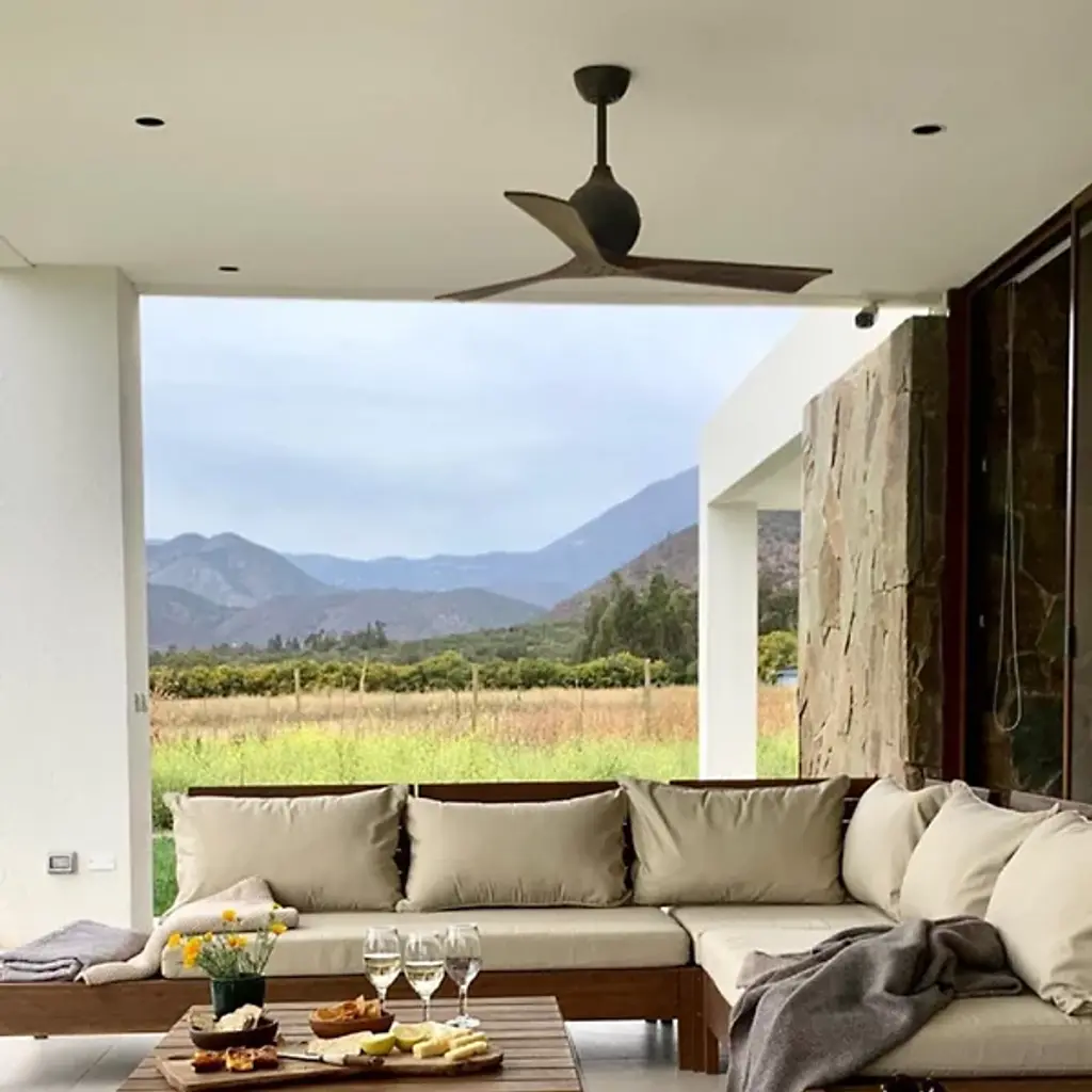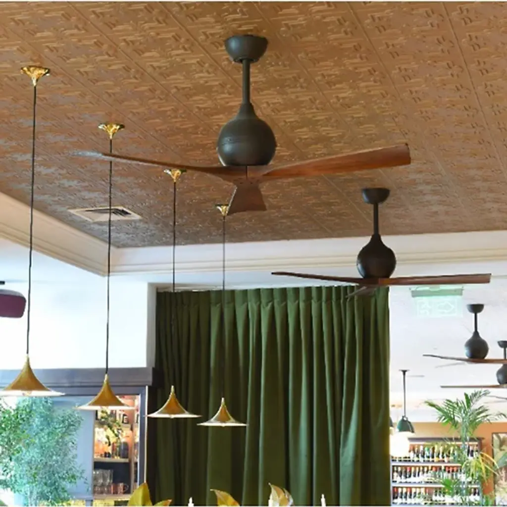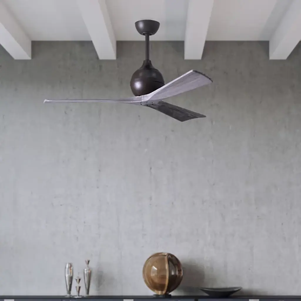 With 3 solid wood walnut stained CNC-cut blades, the Atlas Fan Company Irene 3-Blade Ceiling Fan brings paddle fans to a whole new level of style. Plus, the Irene runs off of an extremely efficient (and quiet) DC motor. Includes a handheld remote with 6-speeds and reverse control.