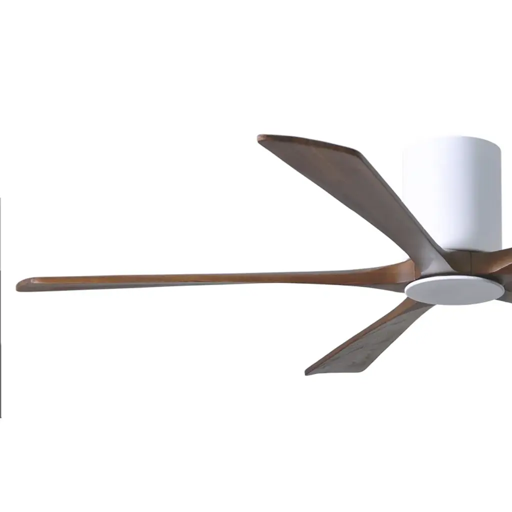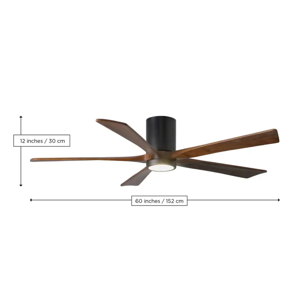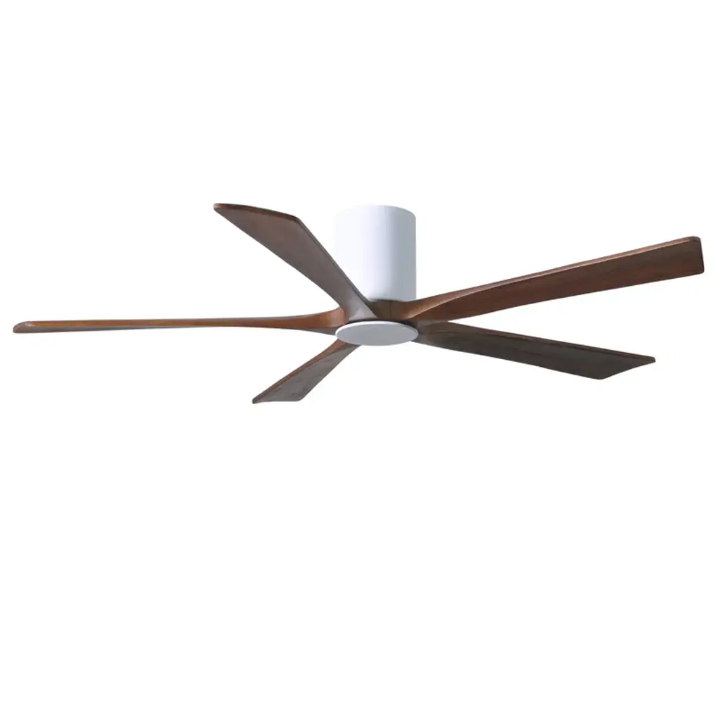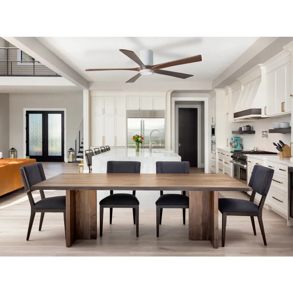 Wood + wind. Built with five solid walnut blades, this ceiling fan juxtaposes the rustic character of its wood grains against a neat minimalist silhouette. It spins at six speeds, which you control from a wall – or with the handy remote. An integrated LED light brightens up your newly breezy space.