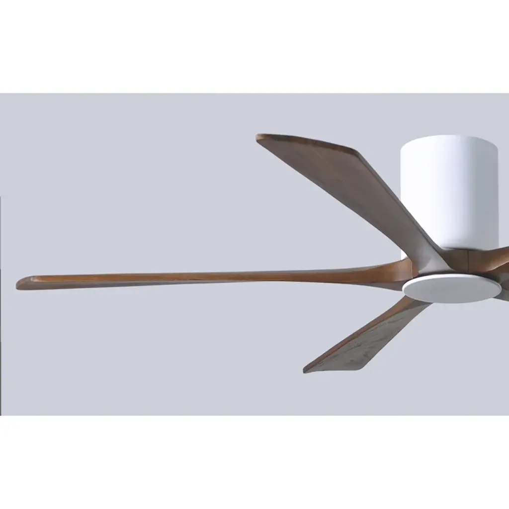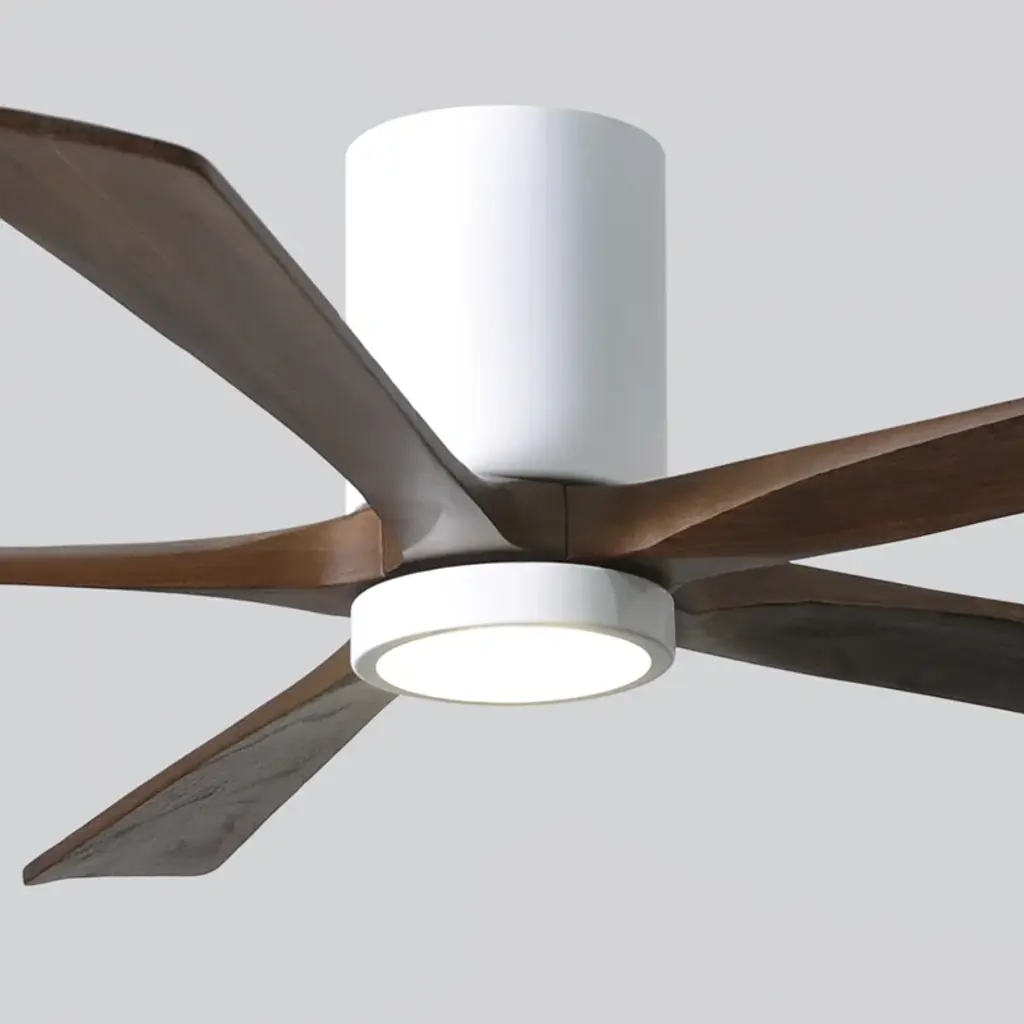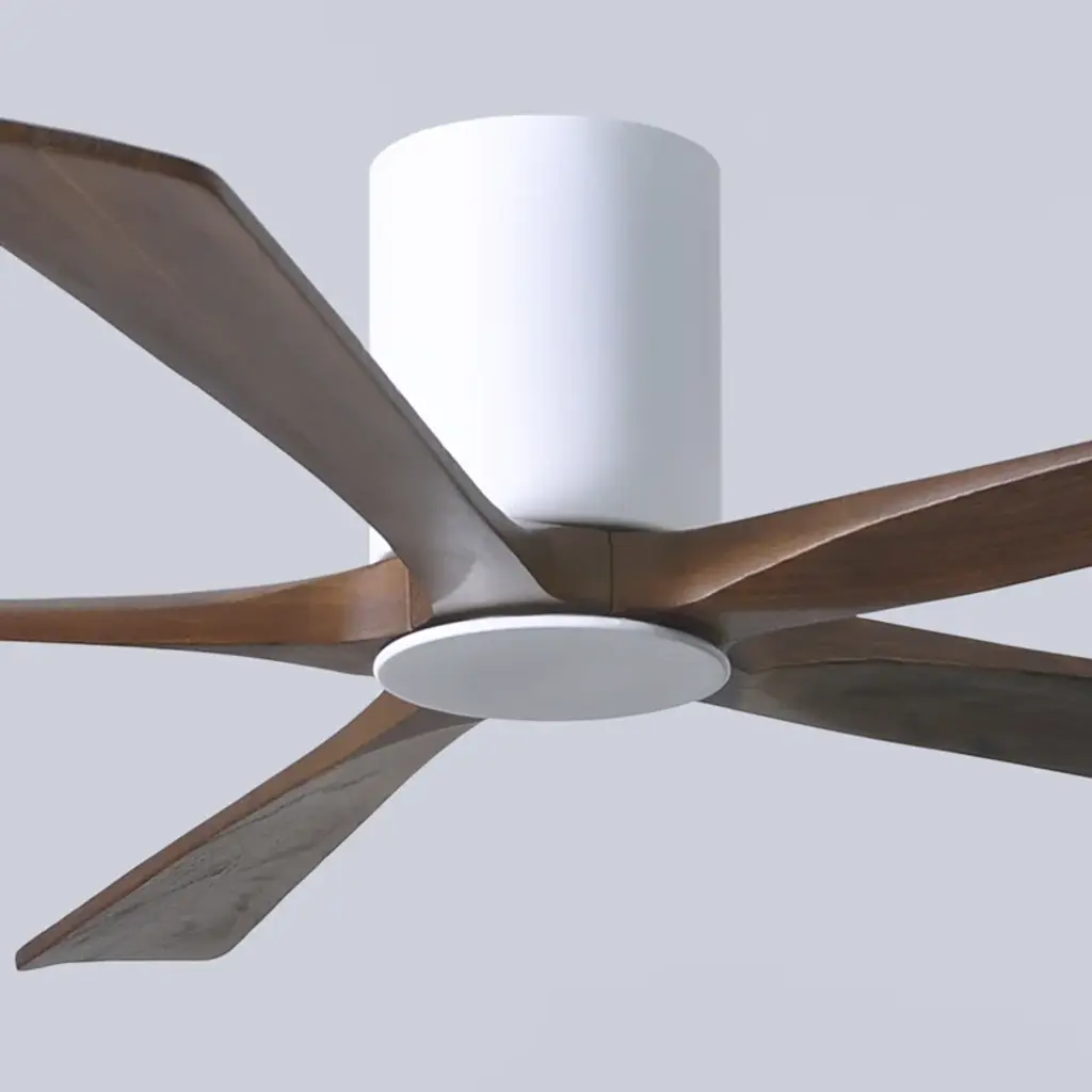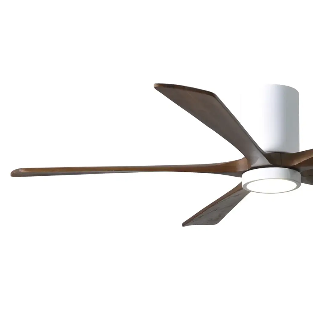 Wood + wind. Built with five solid walnut blades, this ceiling fan juxtaposes the rustic character of its wood grains against a neat minimalist silhouette. It spins at six speeds, which you control from a wall – or with the handy remote. An integrated LED light brightens up your newly breezy space.
