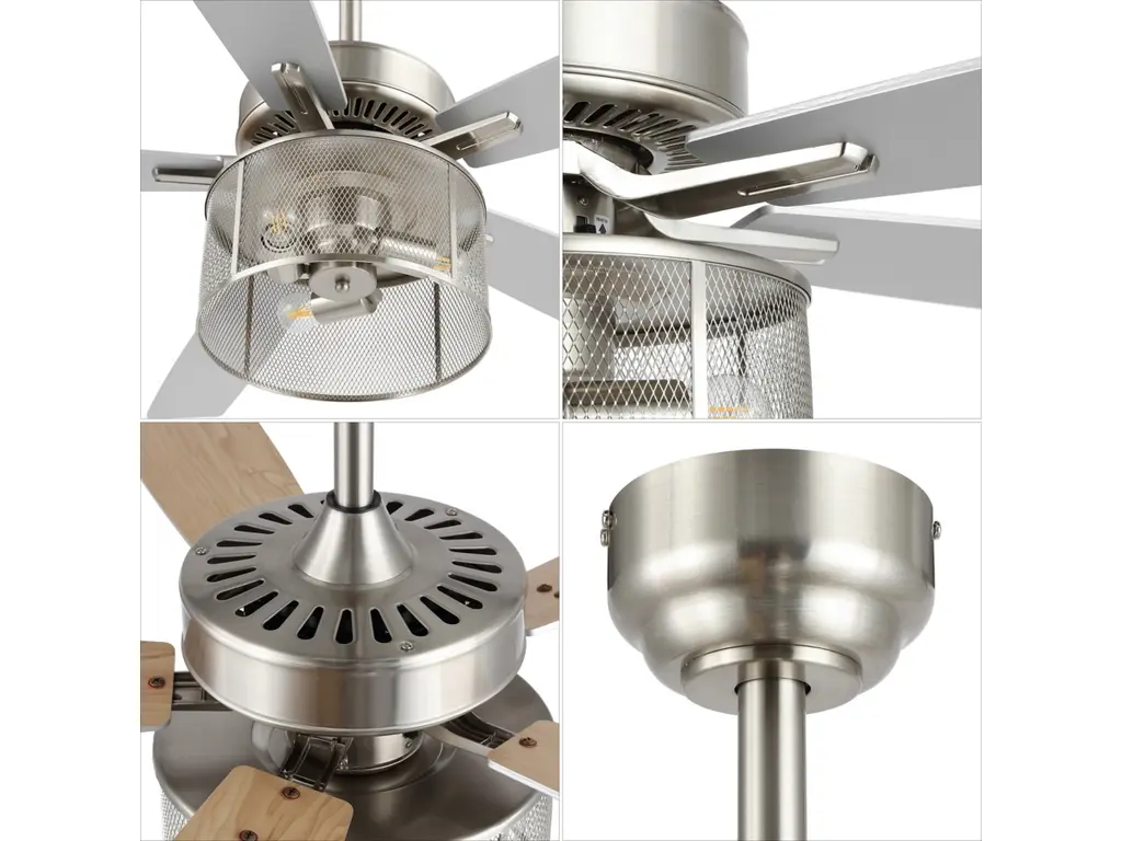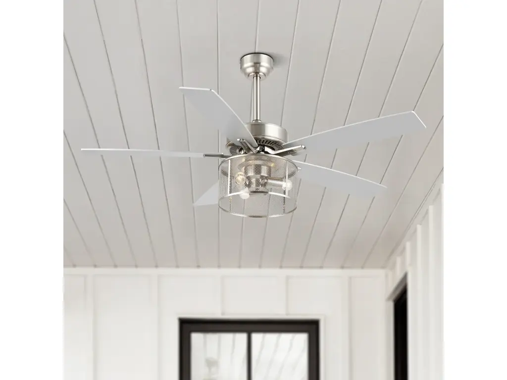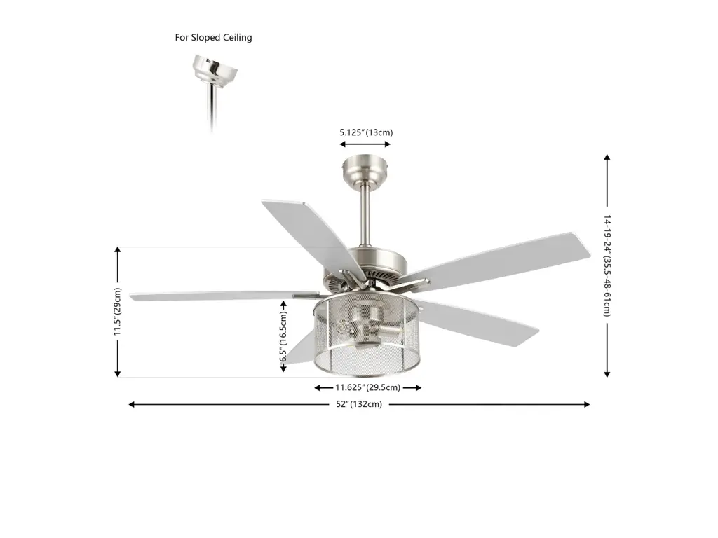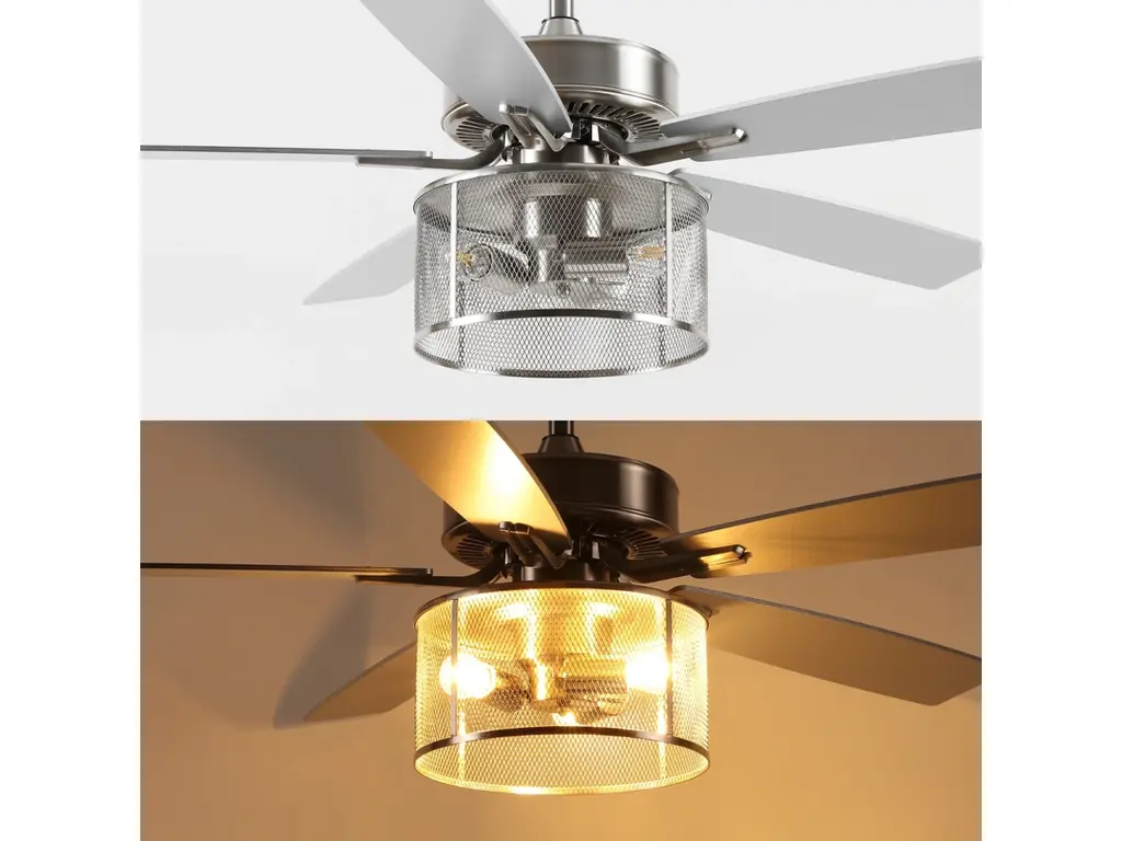 This 52" rustic ceiling fan will add an industrial touch to any room. Wood tones combine with soft metal finishes for modern farmhouse flair. Three Edison-style LED bulbs give off warm, bright light, softened by a metal mesh shade.