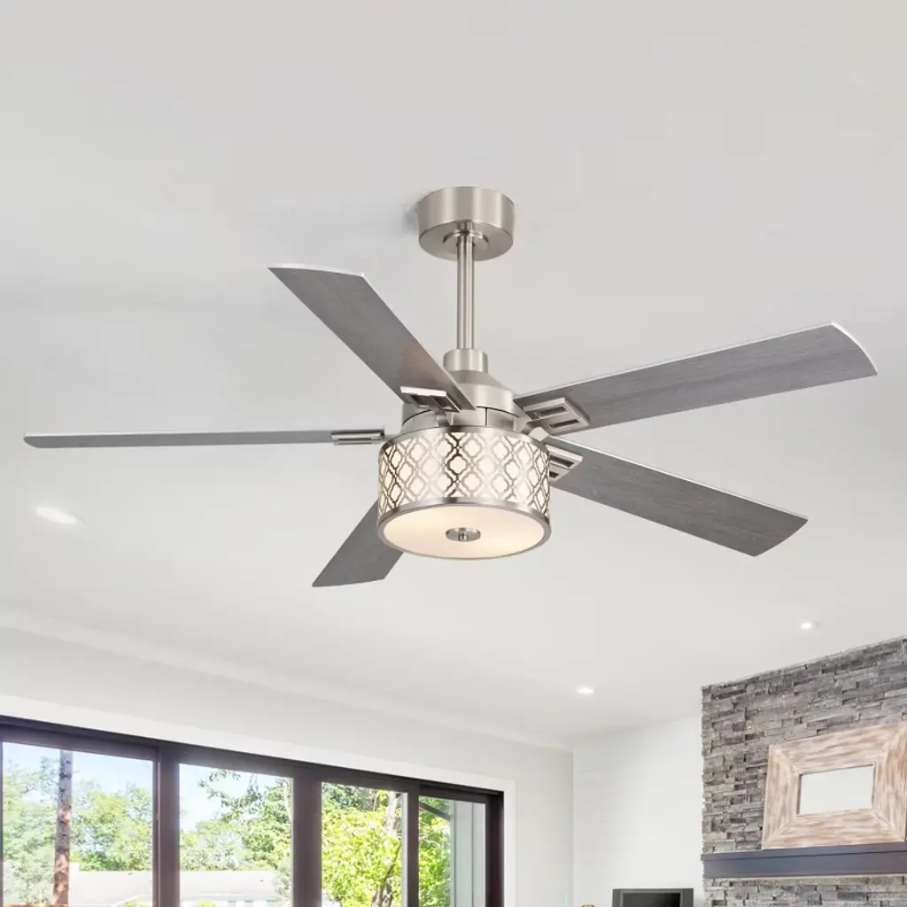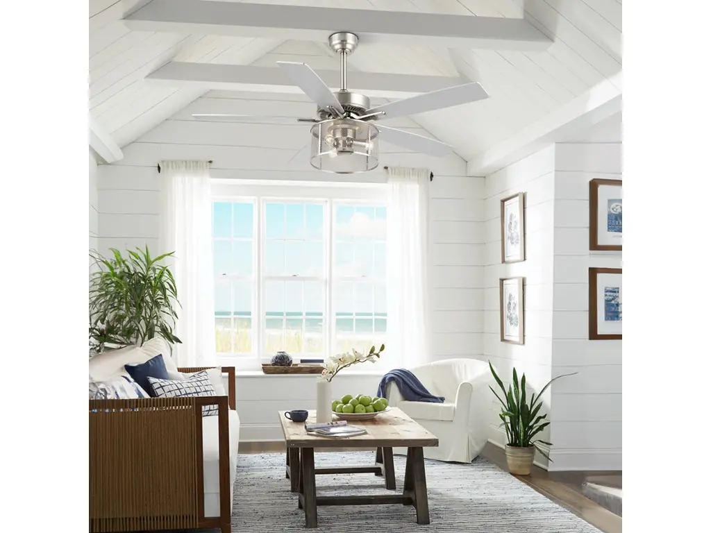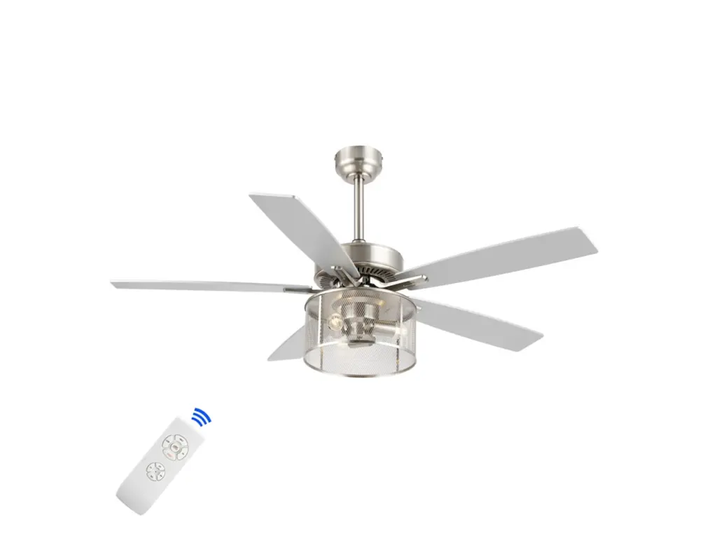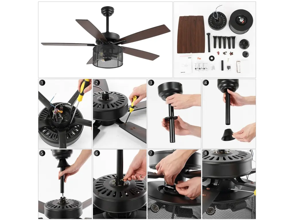 This 52" rustic ceiling fan will add an industrial touch to any room. Wood tones combine with soft metal finishes for modern farmhouse flair. Three Edison-style LED bulbs give off warm, bright light, softened by a metal mesh shade.