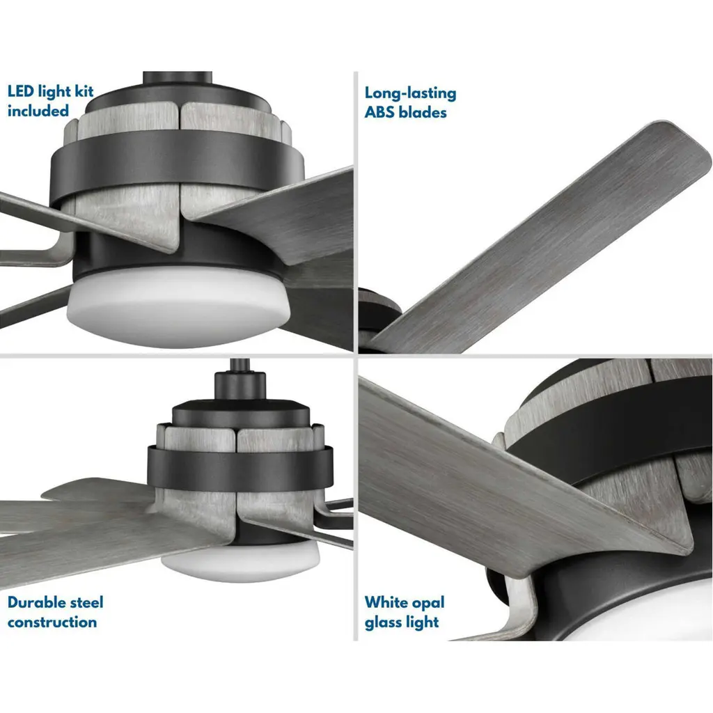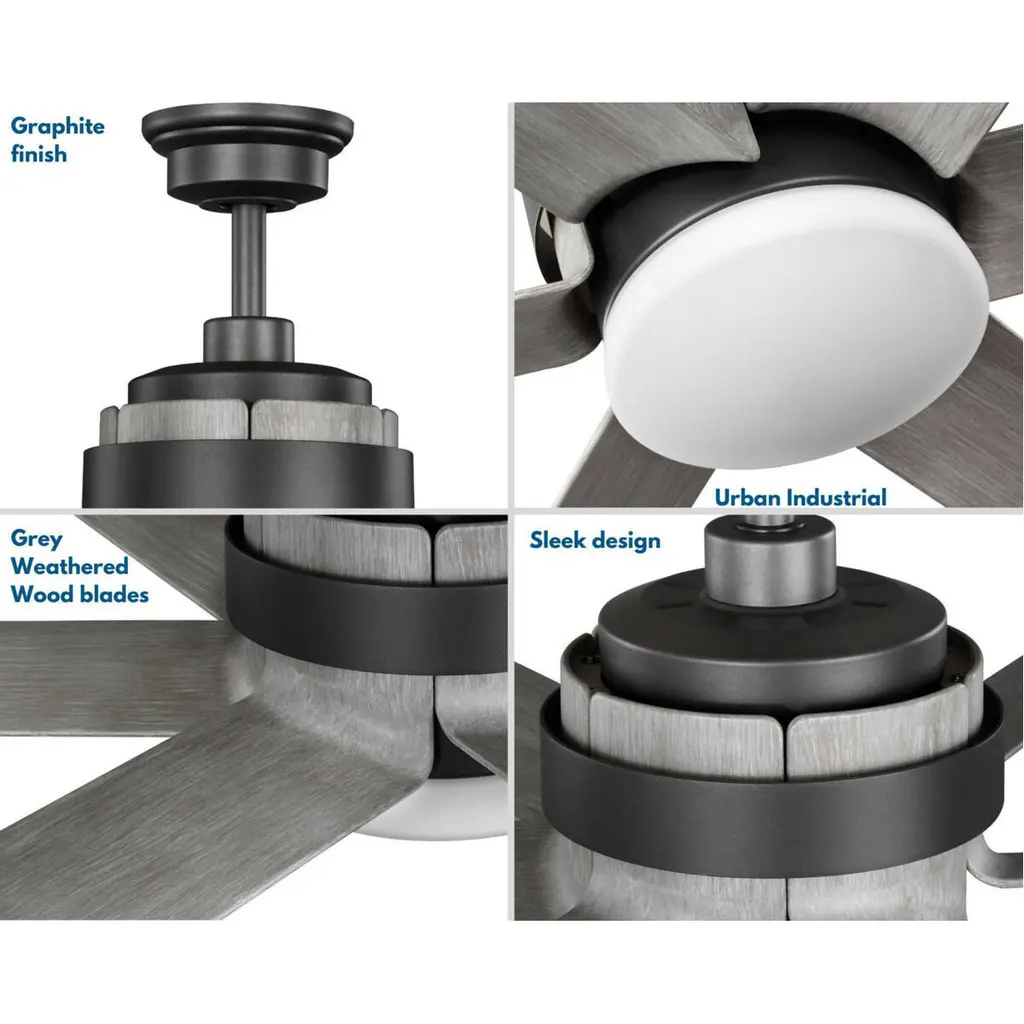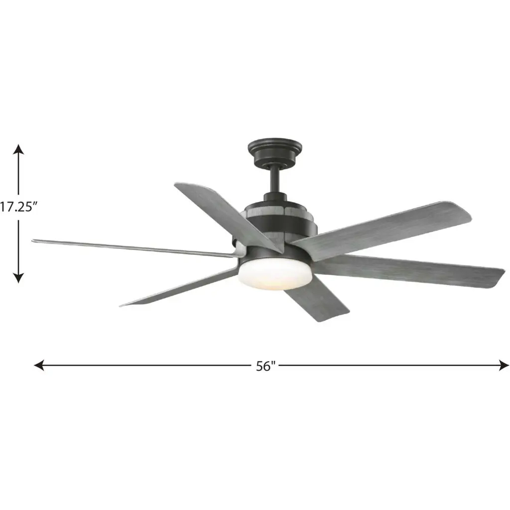 Offer modern industrial style with the Kaysville Collection 6-Blade Grey Weathered Wood 56-Inch DC Motor LED Urban Industrial Ceiling Fan.The canopy, DC motor, and smooth metal band are coated in a gorgeous graphite finish and are complemented by grey weathered wood blades. The long blades are crafted from a strong, all-weather ABS material to prevent warping.A full-function 6-speed remote control with batteries is included so you can adjust full-range dimming and fan speed without breaking a sweat. For ideal illumination, an integrated LED source is included(24w max/2,100 lumens per LPW/120v/90CRI). Dimmable.The ceiling fan's modern industrial design is ideal for any living room in urban industrial style settings.It's time to breathe new life into the mundane every day with timeless and truly transformative lighting. Make your purchase today to begin your journey to a whole new lighting experience. Progress Lighting products are designed for exceptional quality, reliability, and functionality.