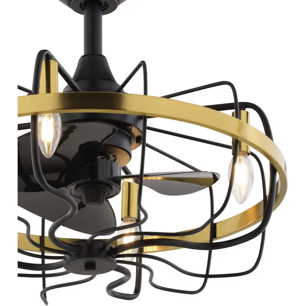 Elevate your contemporary space with the Kenton 21-in ceiling fan, blending industrial charm with modern sophistication. Its captivating cage frame, accented in satin brass on a black backdrop, adds a striking focal point to smaller spaces including family rooms, bedrooms, kitchens, or hallways. With remote control convenience, 3 speed settings, adjustable height, and included dimmable LED bulbs, this fan offers both style and functionality, ensuring lasting elegance and peace of mind for your home with safety certifications and a lifetime limited warranty.