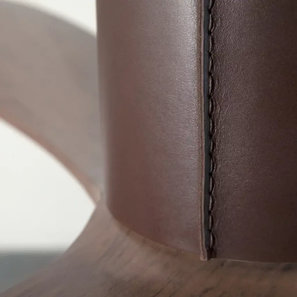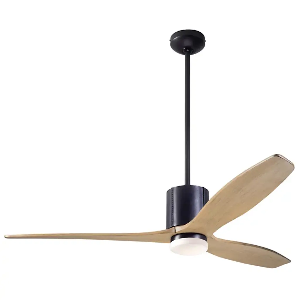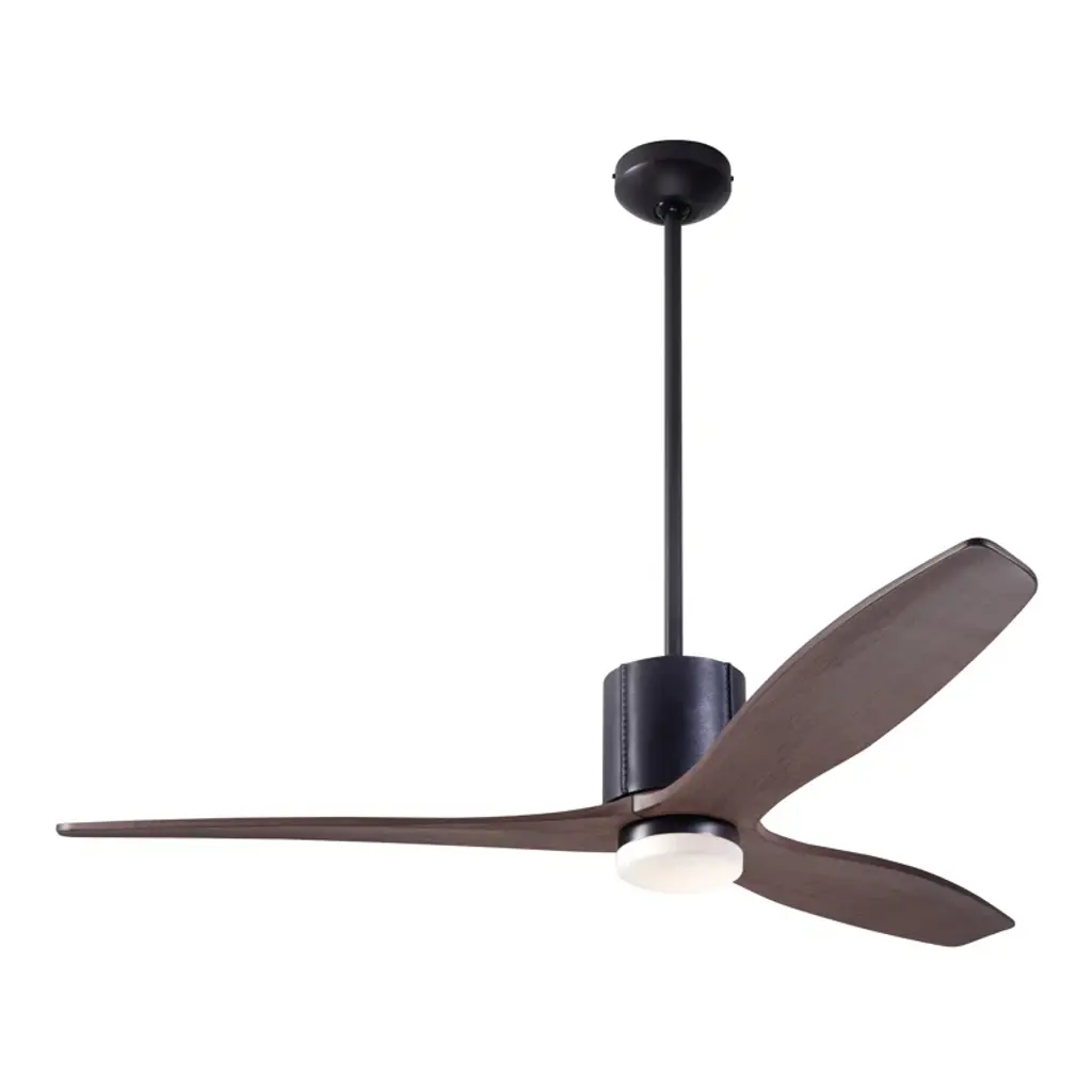 Designed by Dave Ellis of The Modern Fan Company, the LeatherLuxe Ceiling Fan helps tie the ambiance and aesthetic of your rooms with its swift breeze and elegantly accenting leather. This piece showcases the personality of Ellis’ work, where every stitch and subtle contour is crafted with great visual impact in mind. Suspended with an included 3” or 14” downrod, its dark bronze construction provides a graphic silhouette with its deep hue. Wrapping leather defines the form of its cylindrical housing with a soft, lustrous surface and neat stitching. A trio of CNC milled Paulownia wood blades extend out with gestural contours underlining their aerodynamics. A DC motor sends the blades moving across six separate speeds, leaving behind the enduring figure of its elegant leather. Adjust its comfortable breeze with your choice of remote, which adds reversible and light switch toggling.