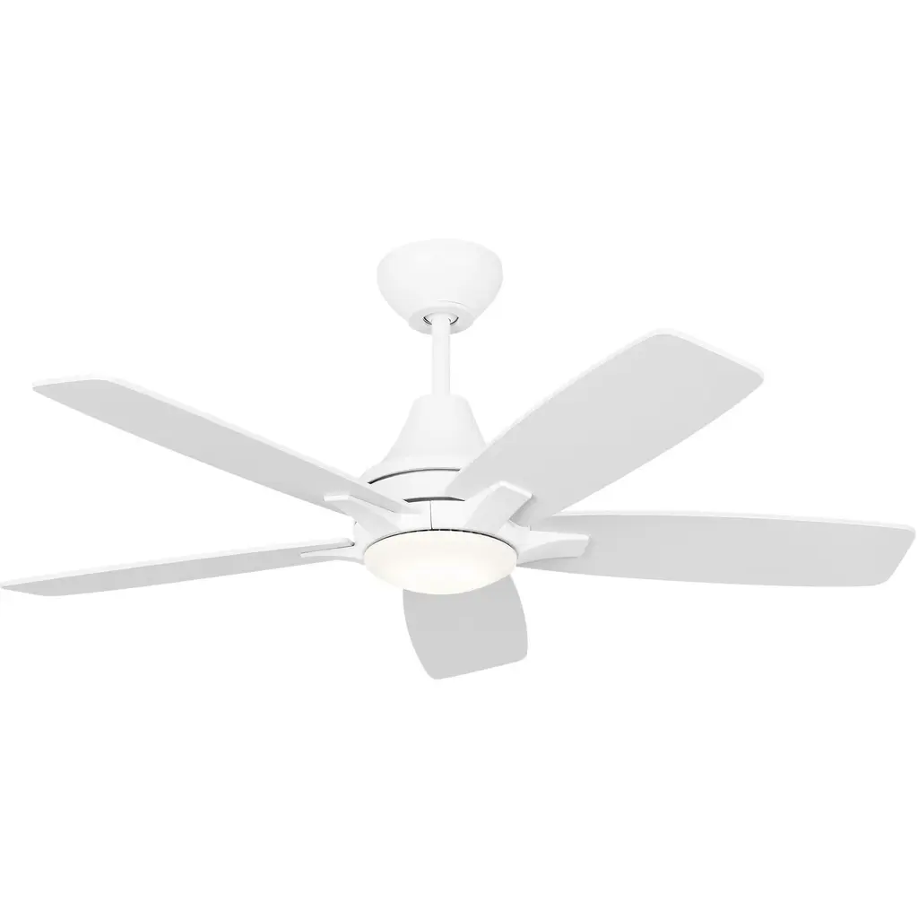 The Generation Lighting Lowden 44 LED Ceiling Fan in Brushed Steel with Silver / Light Grey Weathered Oak Reversible Blades and Light Kit in brushed steel features a 153.0 X 15.0 0 speed motor with a Twelve degree blade pitch.