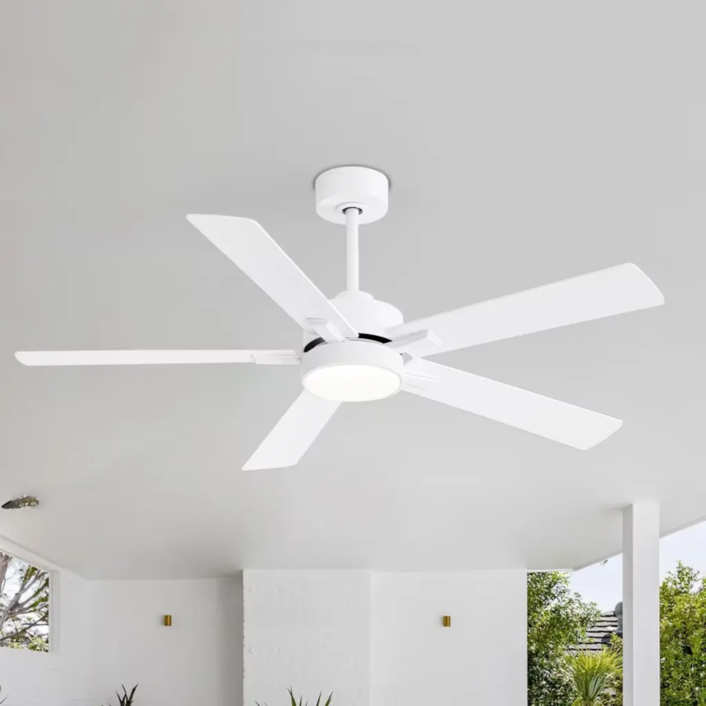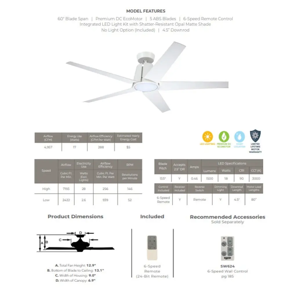 Luminance Floret Eco 60" LED Ceiling Fan with Remote, Satin White Combining modern design and quiet performance, the Floret Eco 60" ceiling fan in satin white features angular blades and integrated LED lighting. Ideal for indoor or covered outdoor spaces, it delivers powerful airflow and stylish simplicity. Key Features: • 60" blade span with reversible premium DC EcoMotor • Satin white metal housing with angular blade design • Integrated LED light with removable matte opal glass shade • Includes 6-speed remote with reverse and dimming control • Suitable for indoor or covered outdoor use