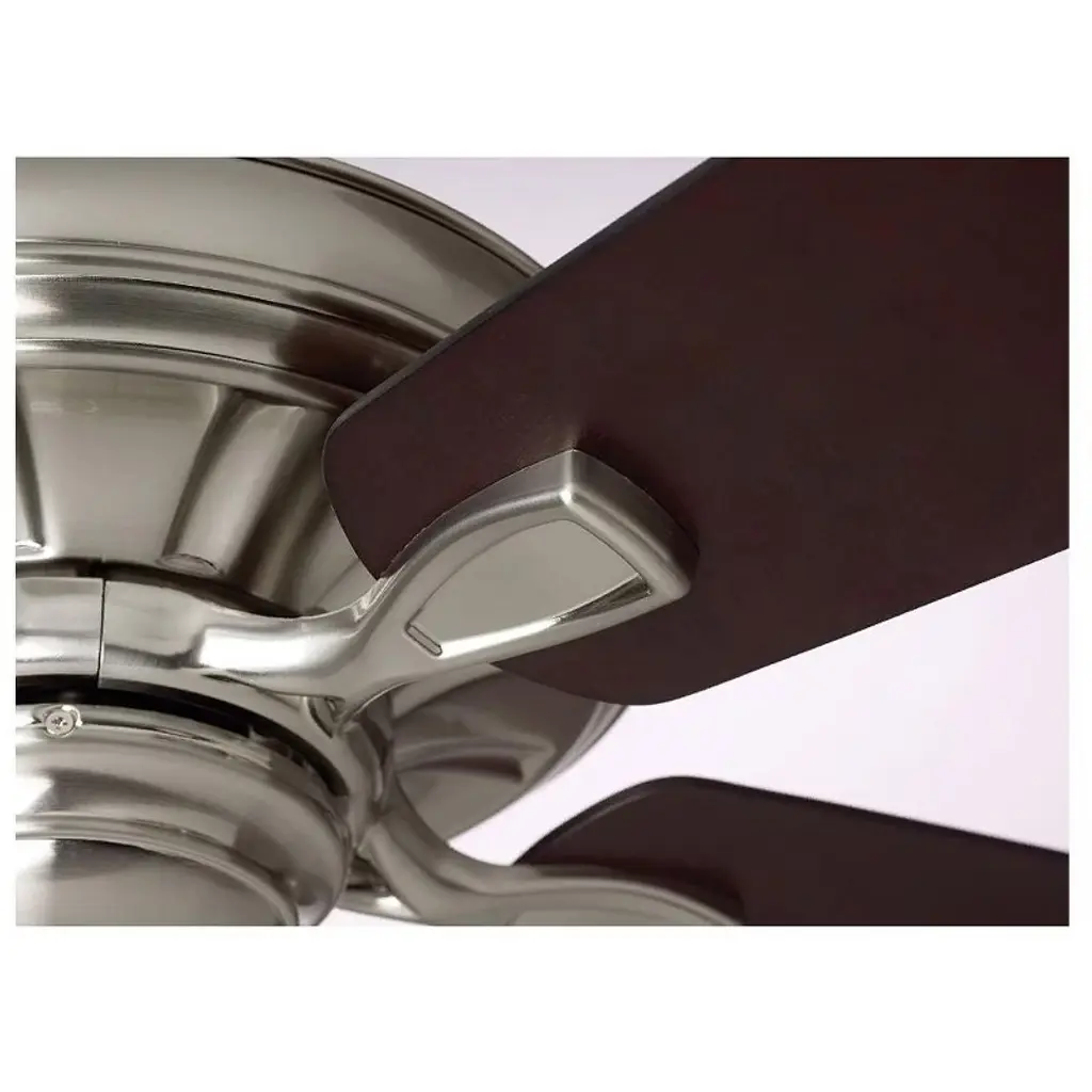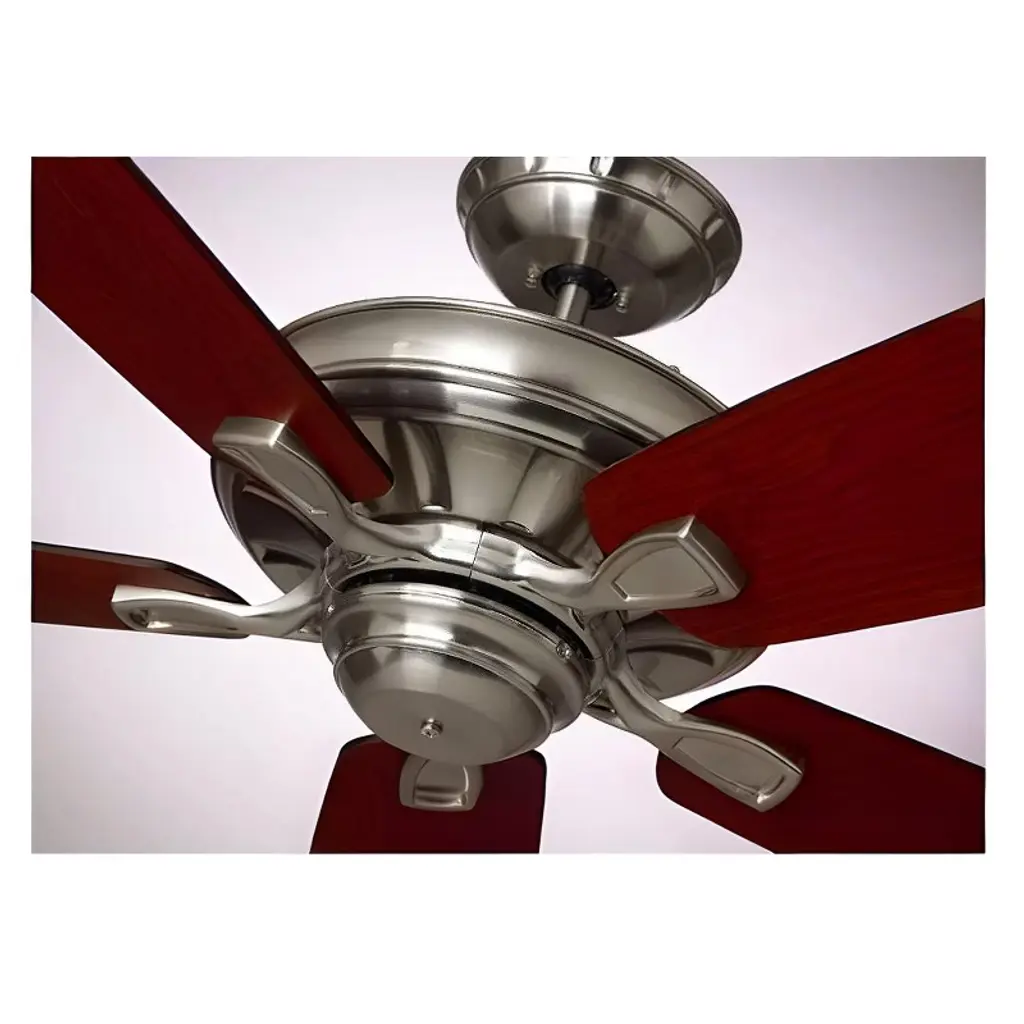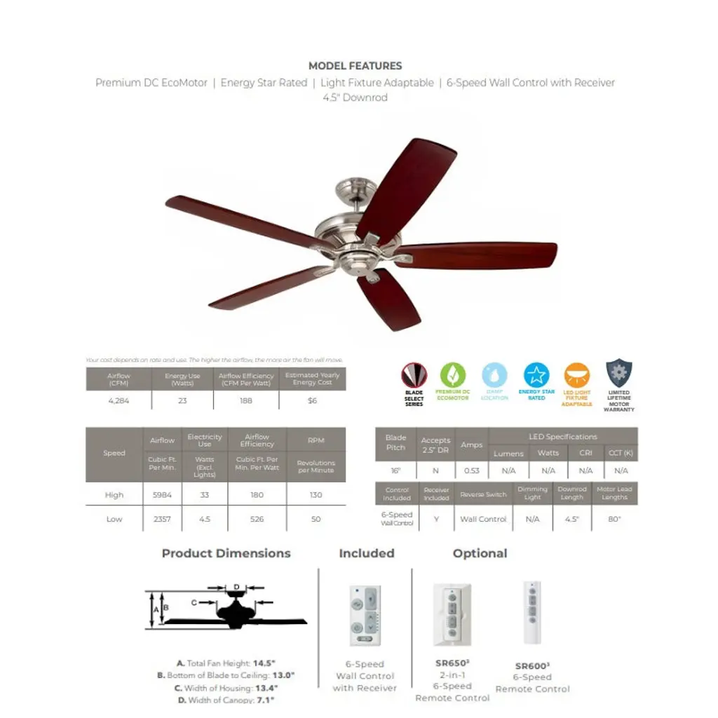 Emerson Carrera Grande Eco 60" Brushed Steel Ceiling Fan CF788BS A refined, Craftsman-inspired ceiling fan for large indoor spaces, the Carrera Grande Eco combines timeless style with cutting-edge energy efficiency. Featuring Emerson’s EcoMotor and 25" solid wood walnut blades, it delivers powerful airflow with whisper-quiet performance. Key Features: • 60" blade span with 16° pitch and 25" solid wood walnut blades • Includes 6-speed LED wall control (SW605) with reverse function • EcoMotor uses up to 75% less energy than standard motors • Downlight compatible (sold separately) • Brushed Steel finish; transitional style design • Sloped ceiling adaptable (kit sold separately) • Indoor use only Specifications: • Brand: Emerson / Luminance • Model: CF788BS • Blade Span: 60 inches • Blade Pitch: 16° • Number of Blades: 5 • Blade Material: Solid Wood (Walnut) • Motor: DC EcoMotor (quiet, reversible, 6-speed) • Max RPM: 50–150 • Voltage: 120V • Max Amps: 0.53 • Airflow (CFM): 5984 • Energy Use: 33 watts • CFM/Watt: 180 • Mount Type: Downrod (4.5" included) • Hanging Weight: 17.2 lbs • Fan Height: 13.4" (bottom of fan), 13.0" (bottom of blade) • Fan Body Width: 13.4" • Canopy Width: 7.1" • Minimum Ceiling Height: 8' 1"