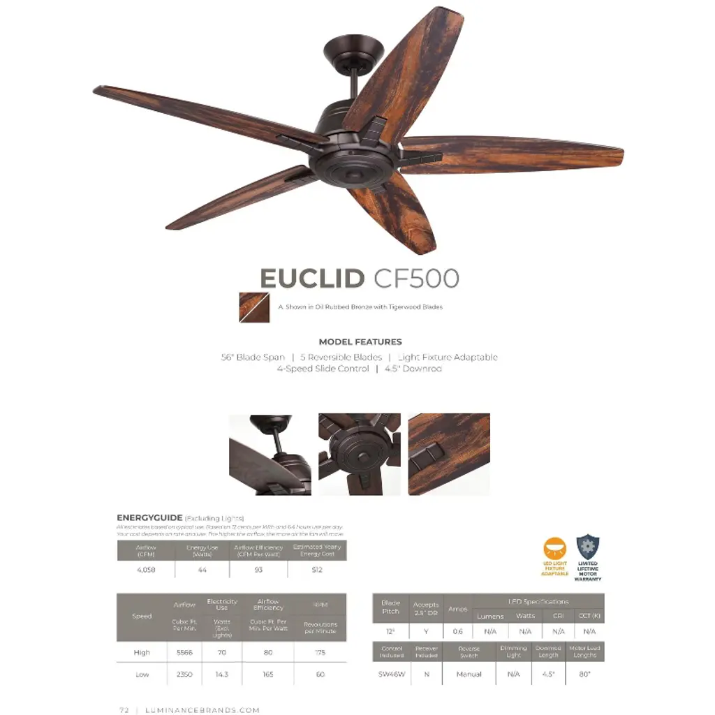 Luminance Kathy Ireland Home Euclid Ceiling Fan with 4-Speed Wall Control | Light Kit Adaptable (Not included)| 56" Modern Fixture with 5x Reversible Blades, Oil Rubbed Bronze This 56-inch modern ceiling fan features a powerful 188 mm x 20 mm motor for optimal airflow. It includes five reversible Tigerwood/Coffee blades and a 4-speed wall control for convenience. Key Features: • 56" blade span with 5 reversible Tigerwood/Coffee blades • Powerful 188 mm x 20 mm motor for superior air movement • Includes 4.5" downrod • 4-speed wall control included (SW46W White) • Light kit adaptable (sold separately) Specifications: • Color: Oil Rubbed Bronze • Material: Bronze • Mounting Type: Ceiling Mount, Downrod, Wall Mount • Number of Blades: 5 • Speeds: 4-speed wall control • Wattage: 44W • Voltage: 120V • Dimensions: 25.25 x 11.75 x 11 inches • Weight: 26.3 lbs • Type of Bulb: LED (light kit sold separately) • Control Method: Wall Control (Remote Compatible) • Collection: Euclid