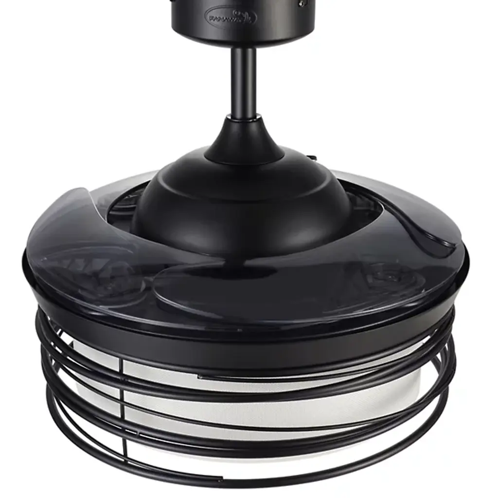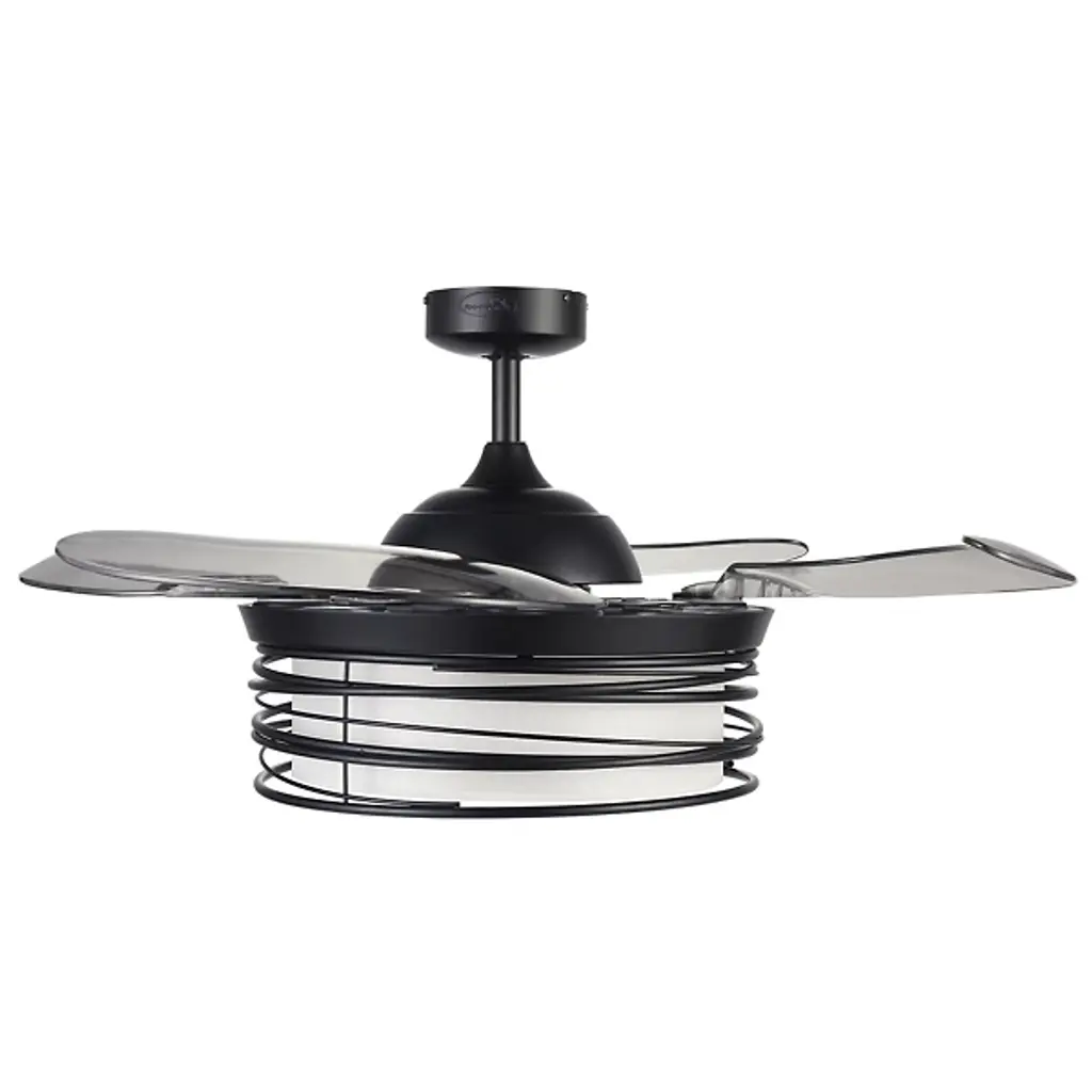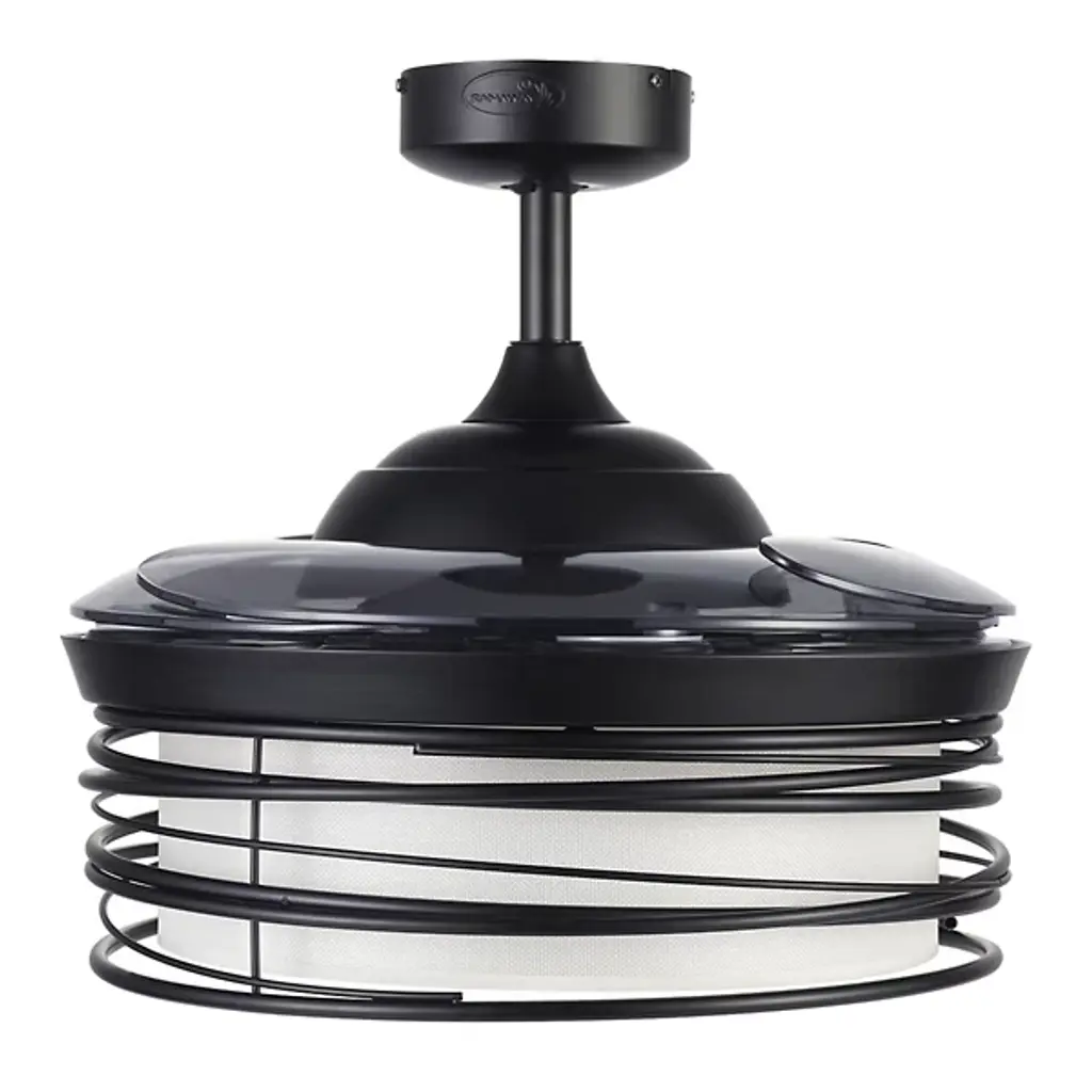 The Luna LED Ceiling Fan from Beacon Lighting combines sleek design with smart functionality. When off, its blades fold in, revealing a striking industrial-style pendant with a spiral cage and soft white linen shade. This space-saving fan includes a dimmable LED panel with 945 lumens, three light color options, and a 3-speed remote control with a wall mount. With its energy-efficient design and modern charm, this fan adds style, comfort, and flexibility to any room in your home.