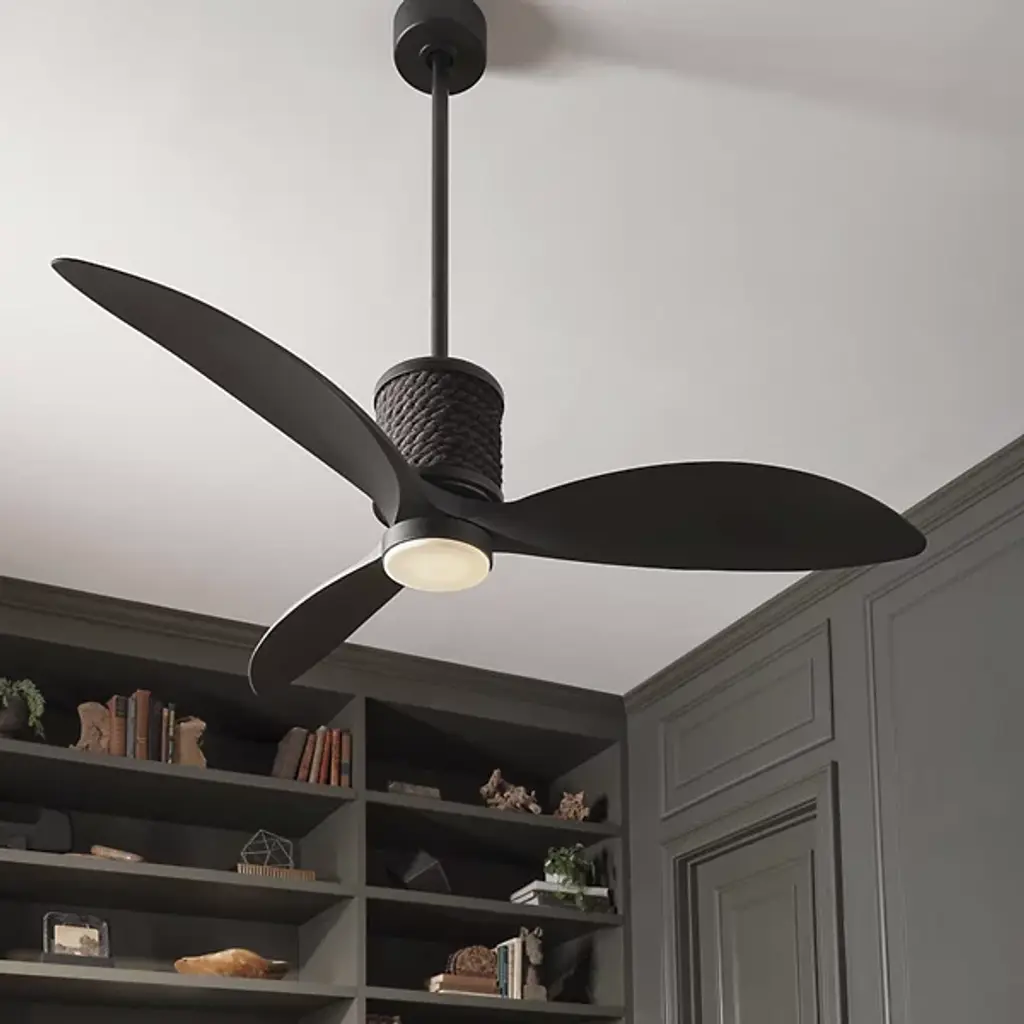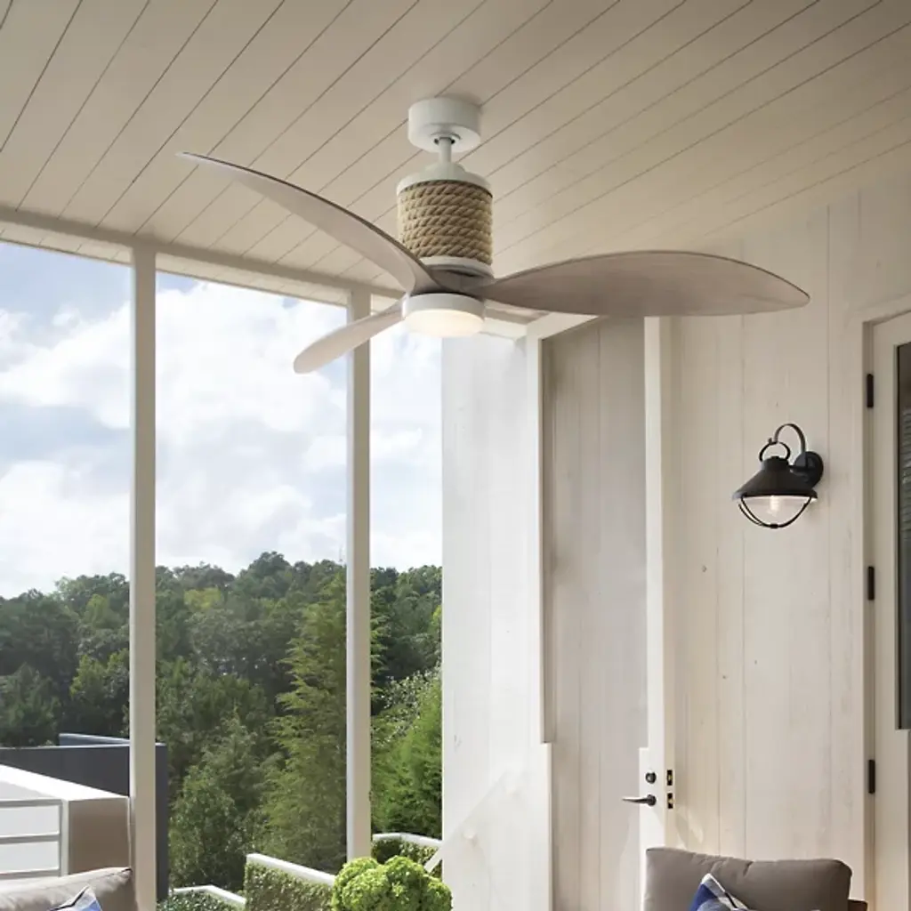 Minimal maritime. Designed with nautical inspiration, the sloped ceiling adaptable Marin LED Ceiling Fan from Hinkley treats your indoor or outdoor spaces to a generous breeze and an inviting glow. It may be minimal, but it sure is rugged. A dramatic rope wrap brings out this rugged quality you can feel visually. Its composite blades show a graceful quality in their subtle curves and pointed forms. These blades are excellent air circulating devices, spinning across six reversible speeds with a wall control. The piece surprises with a low-key LED light source that passes through an etched opal diffuser for an inviting ambiance. Comes with Hinkley's HIRO smart fan control system allowing you to control your fan using a smartphone app or voice assistant like Amazon Alexa or Google Assistant.