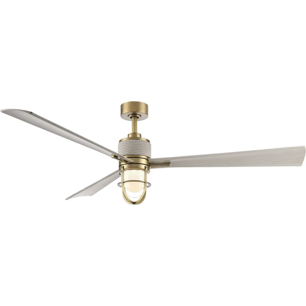 Minimal maritime. Designed with nautical inspiration, the sloped ceiling adaptable Marin LED Ceiling Fan from Hinkley treats your indoor or outdoor spaces to a generous breeze and an inviting glow. It may be minimal, but it sure is rugged. A dramatic rope wrap brings out this rugged quality you can feel visually. Its composite blades show a graceful quality in their subtle curves and pointed forms. These blades are excellent air circulating devices, spinning across six reversible speeds with a wall control. The piece surprises with a low-key LED light source that passes through an etched opal diffuser for an inviting ambiance. Comes with Hinkley's HIRO smart fan control system allowing you to control your fan using a smartphone app or voice assistant like Amazon Alexa or Google Assistant.
