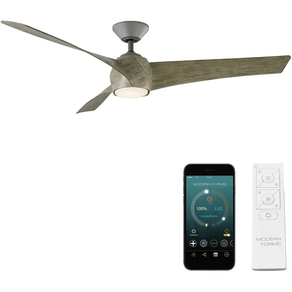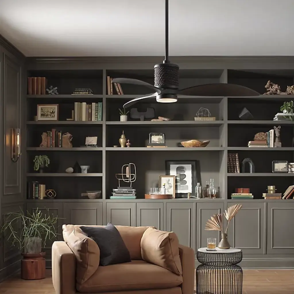 Minimal maritime. Designed with nautical inspiration, the sloped ceiling adaptable Marin LED Ceiling Fan from Hinkley treats your indoor or outdoor spaces to a generous breeze and an inviting glow. It may be minimal, but it sure is rugged. A dramatic rope wrap brings out this rugged quality you can feel visually. Its composite blades show a graceful quality in their subtle curves and pointed forms. These blades are excellent air circulating devices, spinning across six reversible speeds with a wall control. The piece surprises with a low-key LED light source that passes through an etched opal diffuser for an inviting ambiance. Comes with Hinkley's HIRO smart fan control system allowing you to control your fan using a smartphone app or voice assistant like Amazon Alexa or Google Assistant.