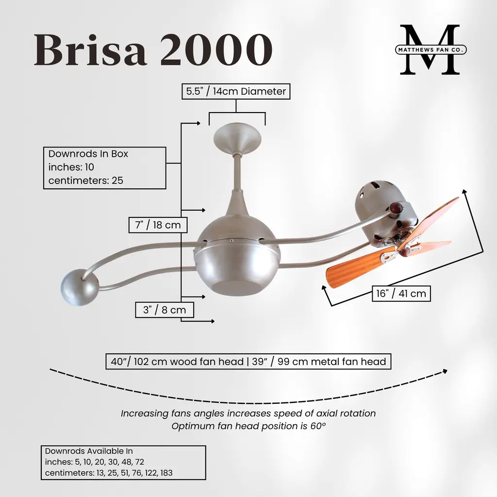 Like satellites orbiting a planet, the Brisa's select mahogany blade head and lunar counterweight gently revolve about its spherical gear housing. The fan head can be infinitely positioned in a 180-degree arc for optimum air movement the greater the angle of the motor to the horizontal support rods (up or down), the faster the axial rotation. A slow, controlled axial rotation is achieved by both fan head position and fan blade speed.