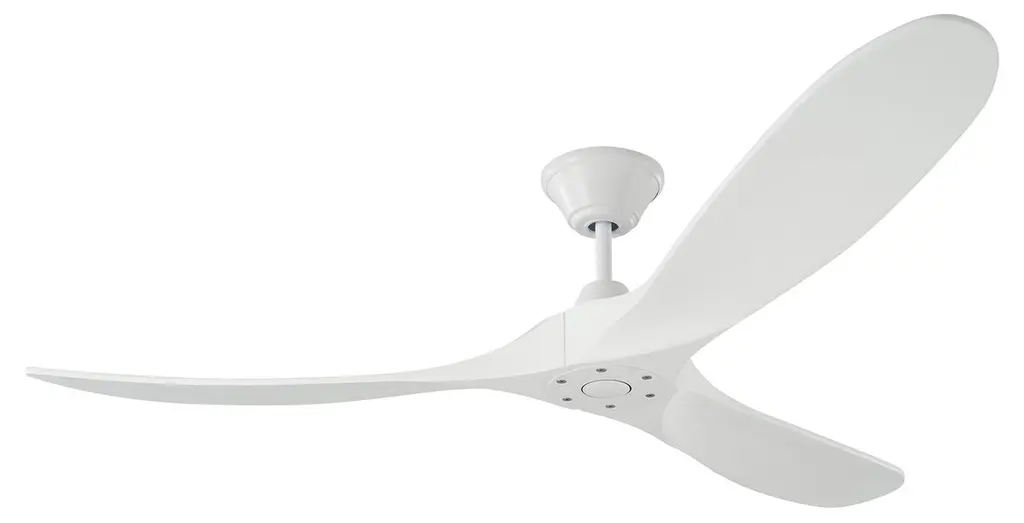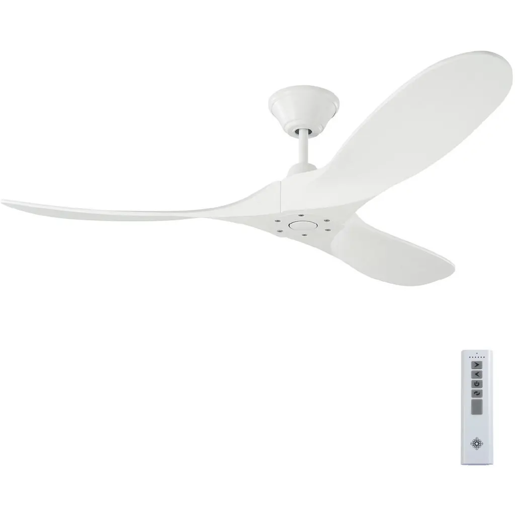 The Maverick 52 in Matte White features an 85.0 X 28.0 6-speed motor with a Thirteen-degree blade pitch. With a sleek modern silhouette, a DC motor, and super energy-efficiency, the 52" Maverick II ceiling fan features softly rounded blades and elegantly simple housing. Maverick has a 52-inch blade sweep and a 3-blade design that delivers a distinct profile and incredible airflow for living rooms, great rooms, or outdoor covered areas. It includes a hand-held remote with six speeds. It reverses and is available in six distinct finish options: Brushed Steel housing with Dark Walnut blades, Brushed Steel housing with Koa blades, Matte Black housing with Dark Walnut Blades, Aged Pewter housing with Light Grey Weathered Oak blades, Matte Black housing with Matte Black blades and Matte White housing with Matte White blades. All versions feature beautiful hand-carved balsa wood blades. ENERGY STAR qualified. Maverick fans are damp-rated and may be used indoors and in covered outdoor spaces.