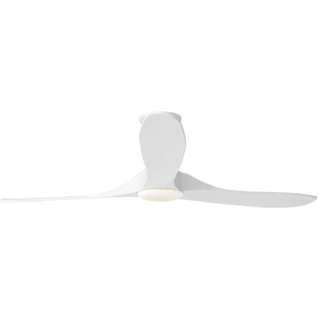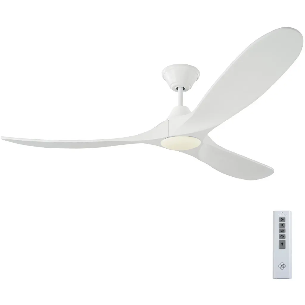 The Maverick 60 LED in Matte White features an 85.0 X 28.0 6-speed motor with a Thirteen-degree blade pitch. The famous Maverick ceiling fan is now available with an integrated LED light. This advanced LED technology is carefully designed and selected to have the highest quality LED chipsets for superior performance and reliability. With a sleek modern silhouette, a DC motor, and super energy efficiency, the Maverick LED ceiling fan features softly rounded blades and elegantly simple housing. Maverick LED is available in 52, 60, and 70-inch blade sweep and a 3-blade design that delivers a distinct profile and incredible airflow for living rooms, great rooms, or outdoor covered areas. It includes a hand-held remote with six speeds and reverses. All versions feature beautiful hand-carved balsa wood blades. ENERGY STAR qualified. Maverick fans are damp-rated. Aß