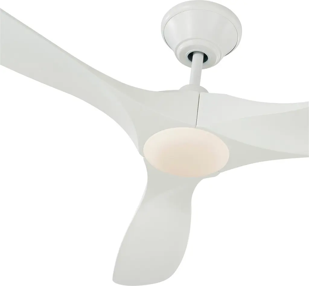 Featuring three hand-carved balsa wood blades with a matte white finish and coordinating hardware, this EnergyStar-rated ceiling fan is also damp-rated for use in covered outdoor spaces and operates with an energy-efficient, six-speed DC motor. An integrated 18W LED downlight delivers 1100 lumens of output. We especially love how the distinctive, swooping design of the blades promotes optimal airflow while staying remarkably quiet. Hand-held remote control included.