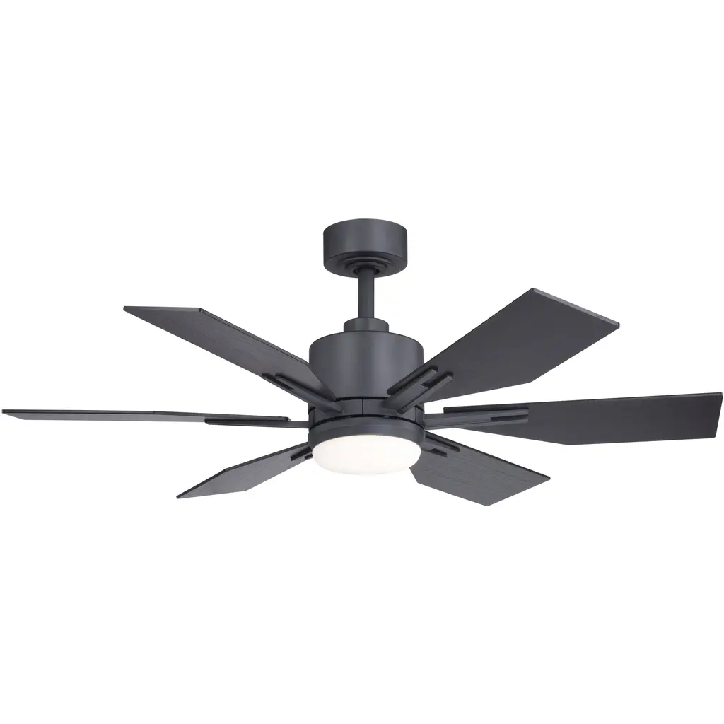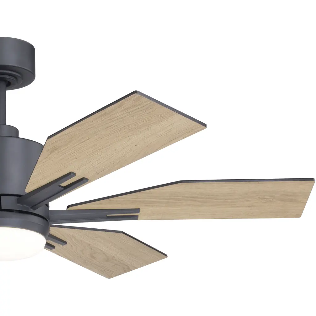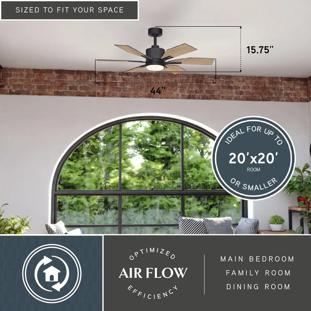 This ceiling fan called Mayfield is a real looker Six squared off wood toned blades are held in place with matte black arms. The cool and warm tones play well together giving it a comforting aesthetic. The Integrated LED light kit provides the right amount of light for a completely functional space.