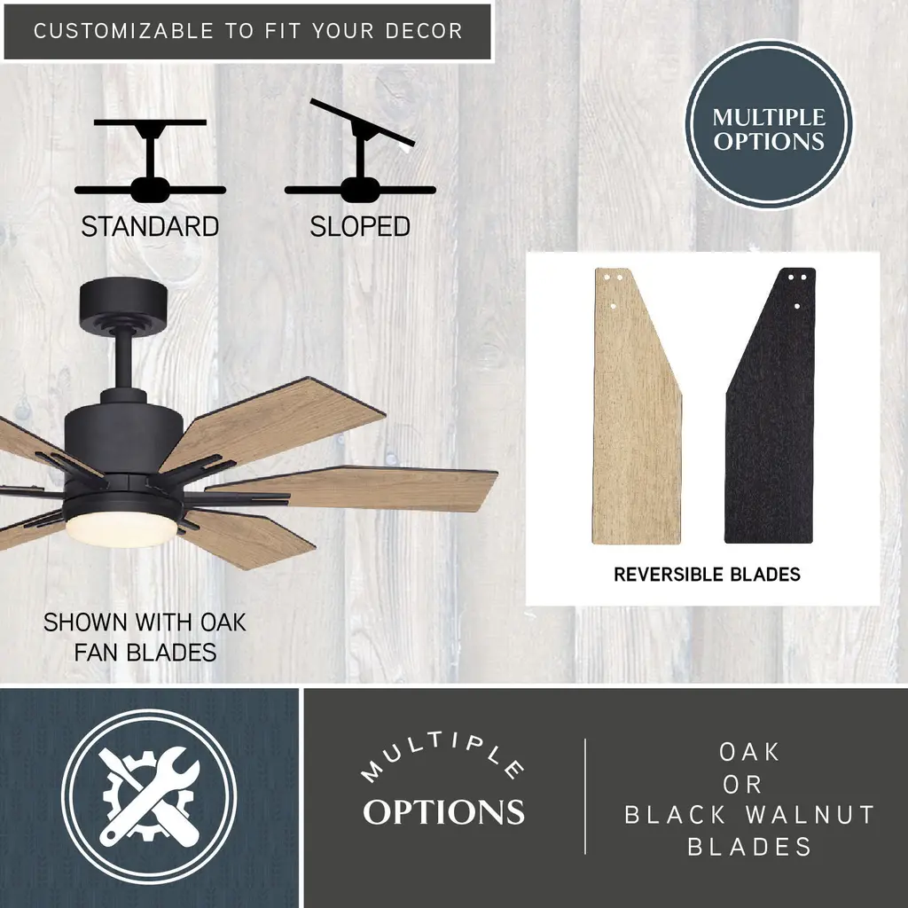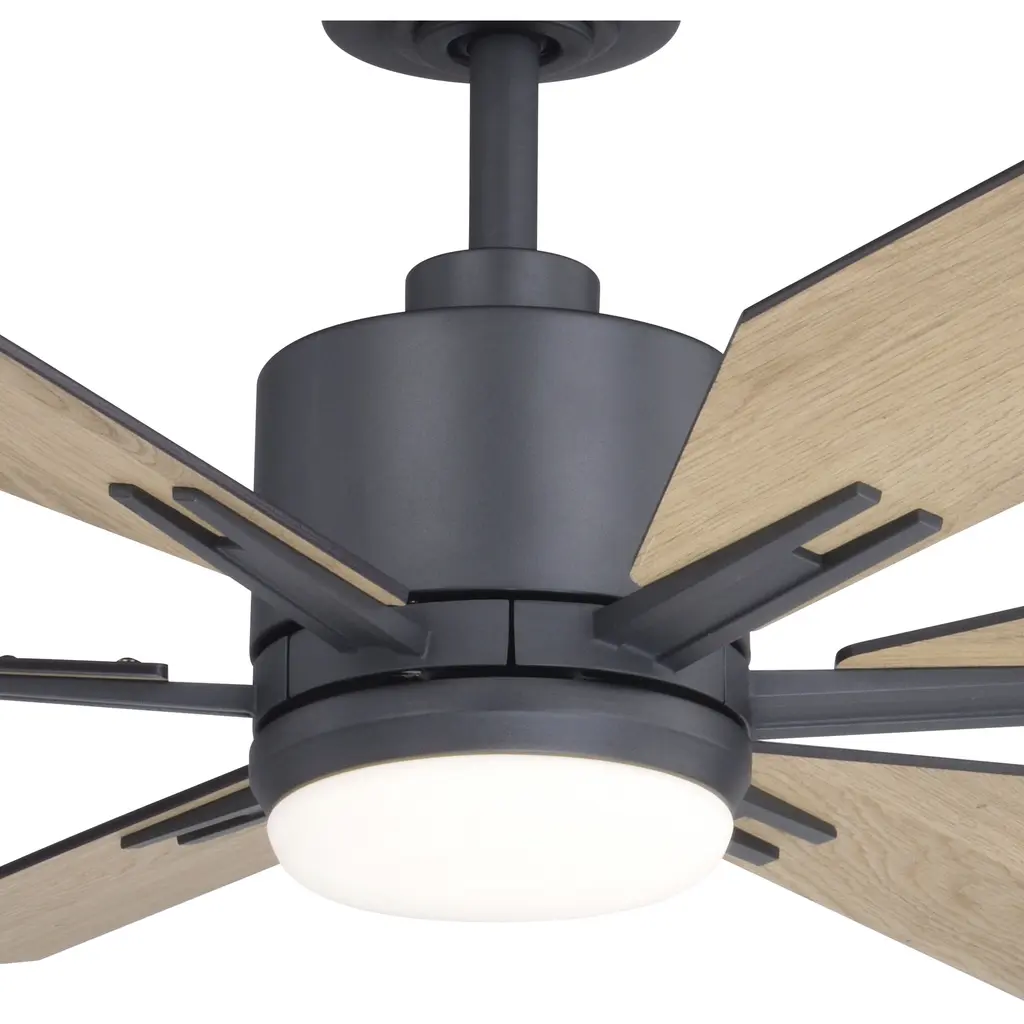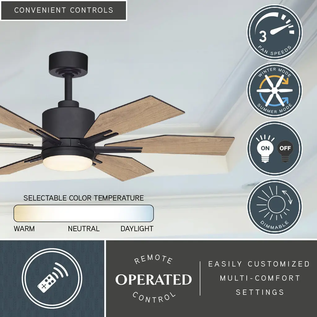 This ceiling fan called Mayfield is a real looker Six squared off wood toned blades are held in place with matte black arms. The cool and warm tones play well together giving it a comforting aesthetic. The Integrated LED light kit provides the right amount of light for a completely functional space.