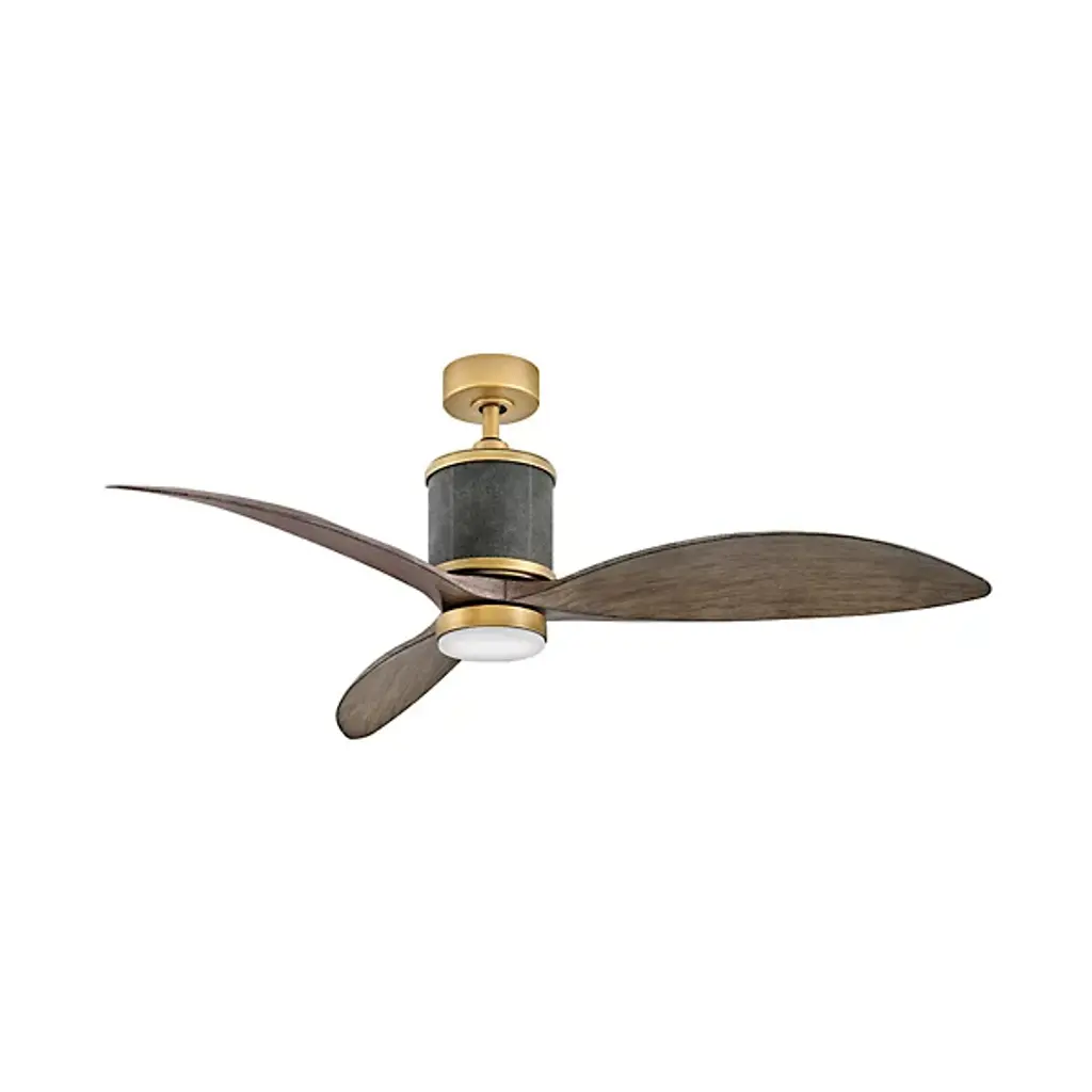 Bring breeze and bright light to inside spaces with the bold, layered lines of the Merrick LED Ceiling Fan from Hinkley Lighting. A luxurious, carefully-considered design, it starts with a smooth metal disc canopy and transmits a short downrod to a cylindrical body banded by smooth metal accents, which seats three cleverly-curved blades above a slim LED lamp set inside an opal diffuser. The fixture is damp-listed and fabulously functional, arriving with Wi-Fi compatibility and an included HIRO remote that whirls the blades through six reversible speeds. Comes with Hinkley's HIRO smart fan control system allowing you to control your fan using a smartphone app or voice assistant like Amazon Alexa or Google Assistant.